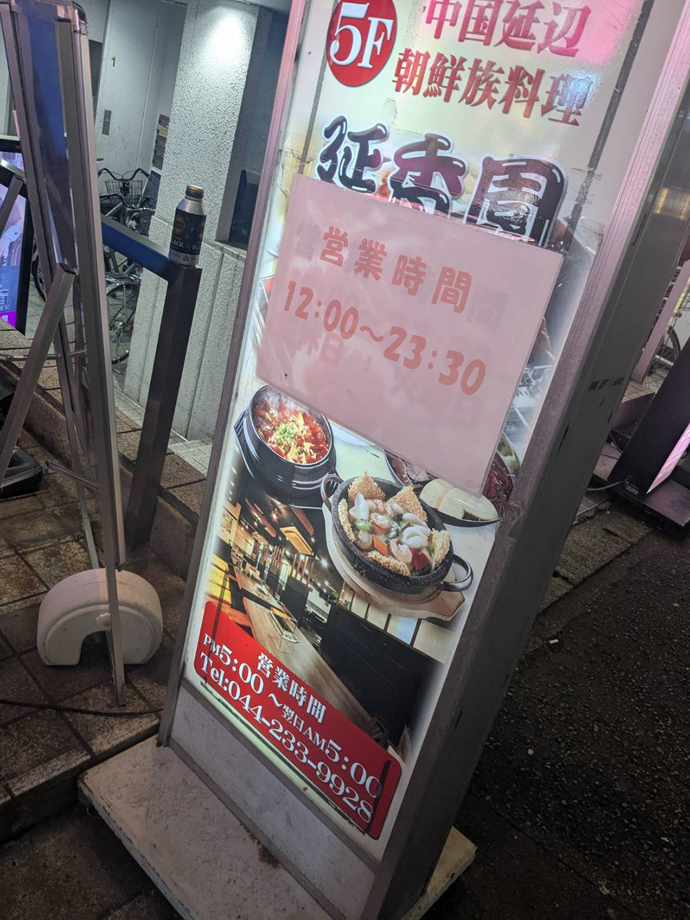 ――そして終演後。“ライブ終わったら、ど~する?”ということで、「ガチのライブを観た後は、ガチのメシが食いたい!」と、チッタの裏通りに移動した俺。川崎駅から“チネチッタ通り”を経て、クラブチッタへと向かう道はすっかりおしゃれになって、街のやさぐれ感もすっかり薄れてしまったが。一本路地に入ると、ちゃんと昭和の香ばしい雰囲気を残してくれてるのが川崎の街。ラ チッタデッラの裏には“ガチ中華”と呼ばれる、日本人に媚びない本格中華が食べれるお店がたくさんあるのだが。この日は「延香園」という本格中国東北・四川料理のお店に行くことに。