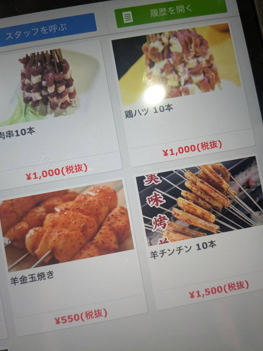 そこで、登場した文明の利器。スマホでメニューを撮影して翻訳をかけると、そのメニューが“チキンネック=鳥首肉串”であることが判明。なんて便利な時代! 同時に翻訳されてる“羊の卵串”や“羊銃”って何? という疑問は一旦置いといて。さっそく店員さんを呼んで、生ビールセットを注文。タブレットを開いて、メインメニューを選ぶことに。