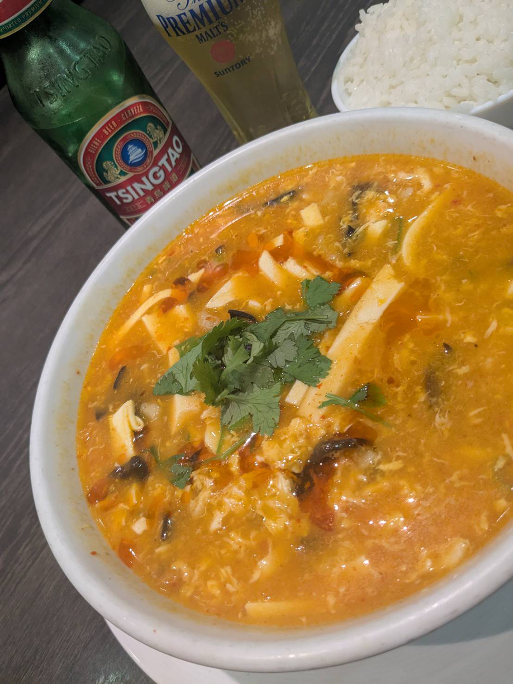 酸辣湯の具材は豆腐と卵ときくらげと……それくらいは分かるけど、あとは何が入ってるか分からない。全然知らない具材が入ってる可能性もあるけど、全部美味い!あまりの美味さにビールも進んで、青島ビールを追加して。ハフハフと酸辣湯を貪り食っては、ジャブジャブとビールを流して、ガチでメシと向き合う俺。締めに白ご飯を酸辣湯にぶっ込んで、おじやにして食べたんだけど、これがまた絶品!川崎で出会ったガチ中華は中国の歴史と誇りを感じる、ガチで美味い酸辣湯でした。MUCCもガチだけど、川崎の中華もガチ!