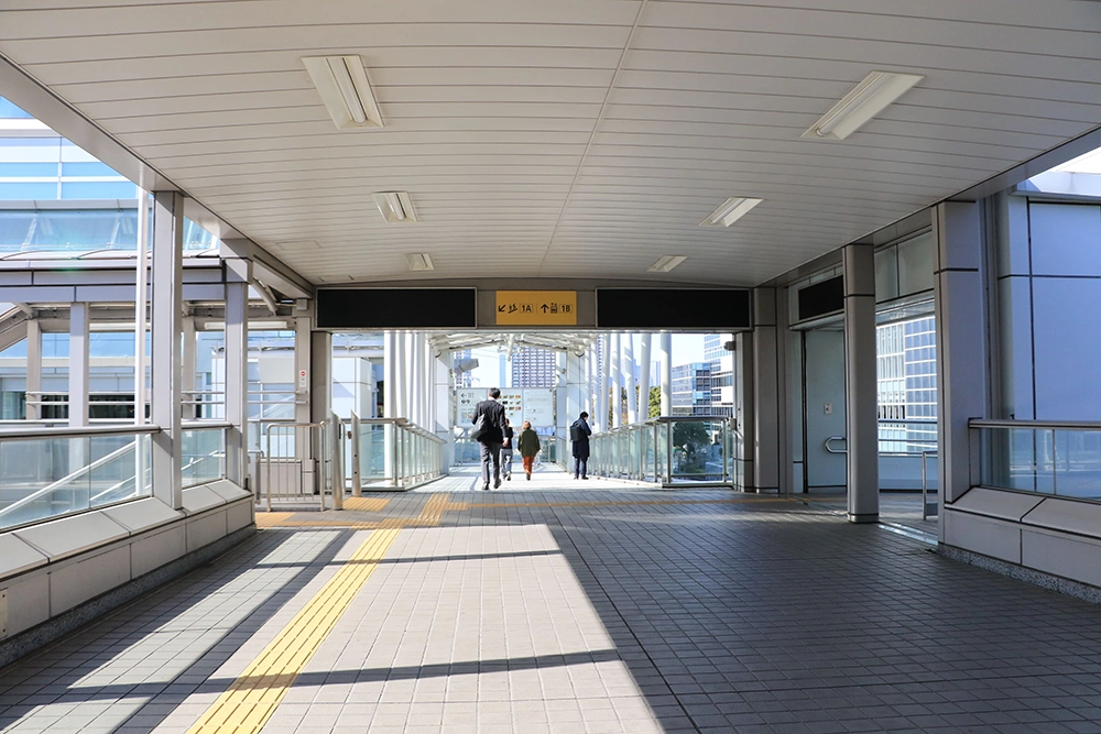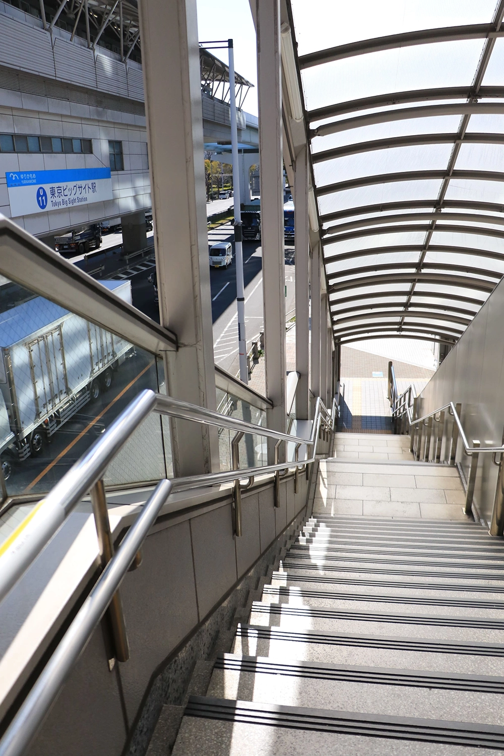 そして、東京ビッグサイト駅からのルート。改札内にコンビニあり。改札を出てペデストリアンデッキを左に曲がってこの通路を進み、左手の階段またはエスカレーターを下ります。(エレベーターもあり)