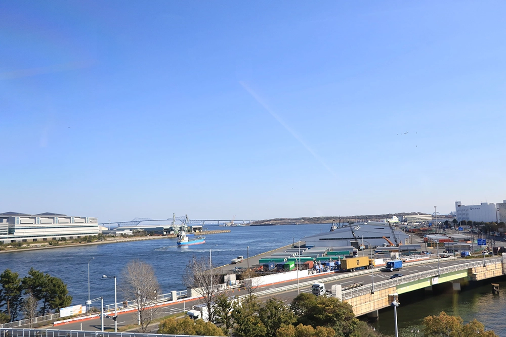2F席後方最上階=4階のロビー部分の外側はガラス張りで、こんな素敵な景色が。なお、橋の右の島が、『TOKYO ISLAND』や『METROCK』の会場である海の森公園。