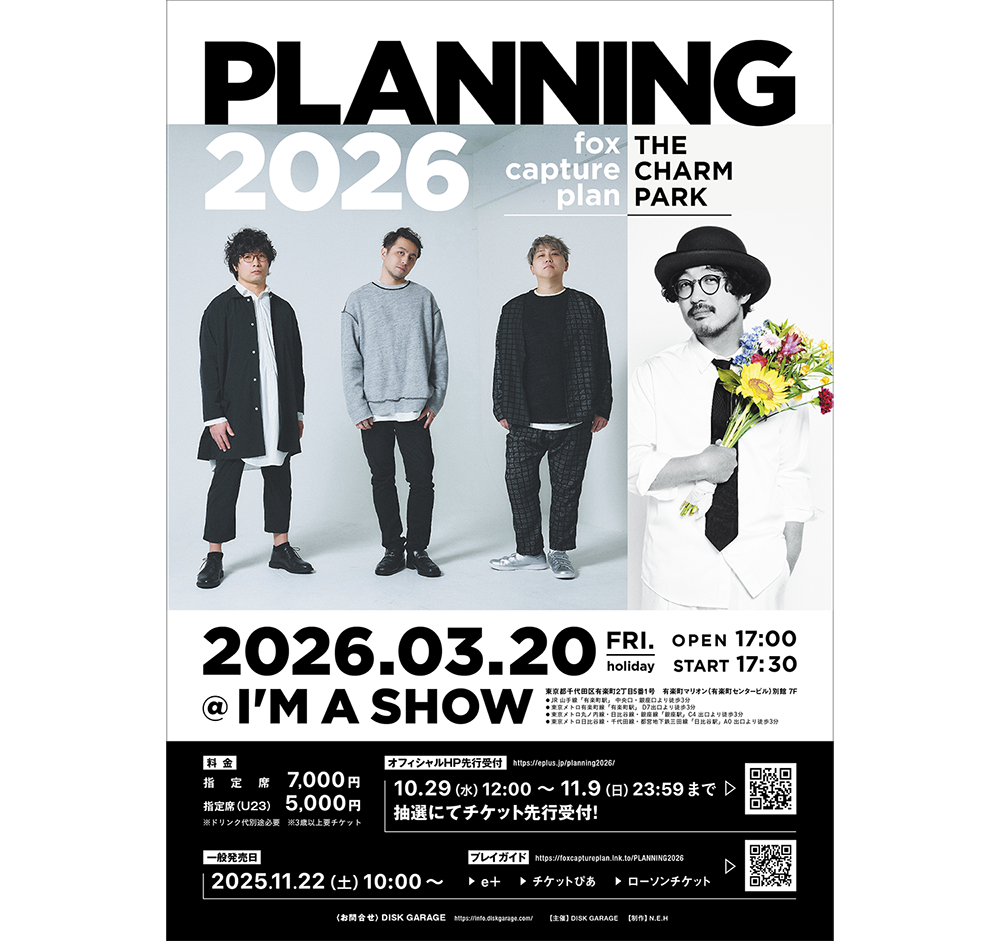 THE CHARM PARKさらにその前を言うと、僕は日本に来て15年ですが、初めて日本に来たときに、知り合いにいろんな場所を案内してもらう中で、初めてビレバン(ヴィレッジヴァンガード)に行って、そこでfox capture plan(以下、フォックス)の楽曲を耳にして。外国人からすると、日本独特のメロディーでインストのバンドをやってることがすごく面白いと思いました。そこから自分は別のバンドで活動して、それが解散して、THE CHARM PARKが始まって、やっと実際にお会いできたんですけど、前からずっと聴いてたような感覚です。