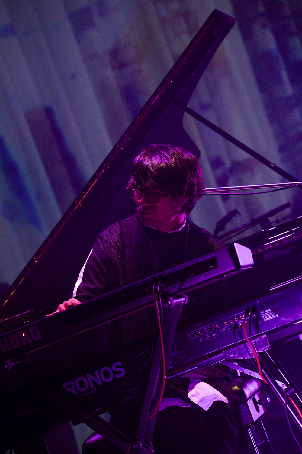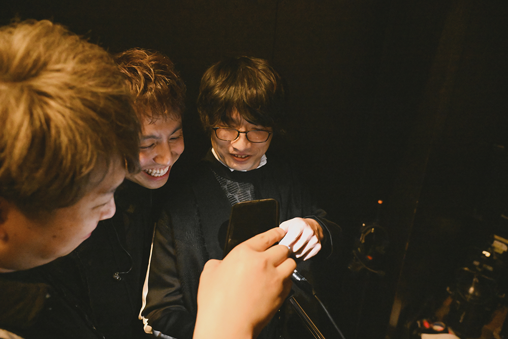 2012年リリースの「Flexible」を紹介する微笑ましいやりとりのあとは、再び『DEEPER』のディープな世界へ。岸本の「このあと、すごい変な曲ばっかり続くんで」という言葉通り、「The curtain of night」から「Strange Disco」へ、チルアウトなムードを経てファンクとジャズとロックが絡み合い、重厚なリズム隊と浮遊感覚のピアノが入り乱れて疾走しながら、井上のマシンガンビートがうなりをあげるファストチューン「Vortex」へなだれこむ。終わった瞬間、岸本が右手を高々と掲げてガッツポーズ。井上が「座って聴く曲じゃないね」と言って笑う。椅子があるのがもったいなく感じるほどの盛り上がりだ。