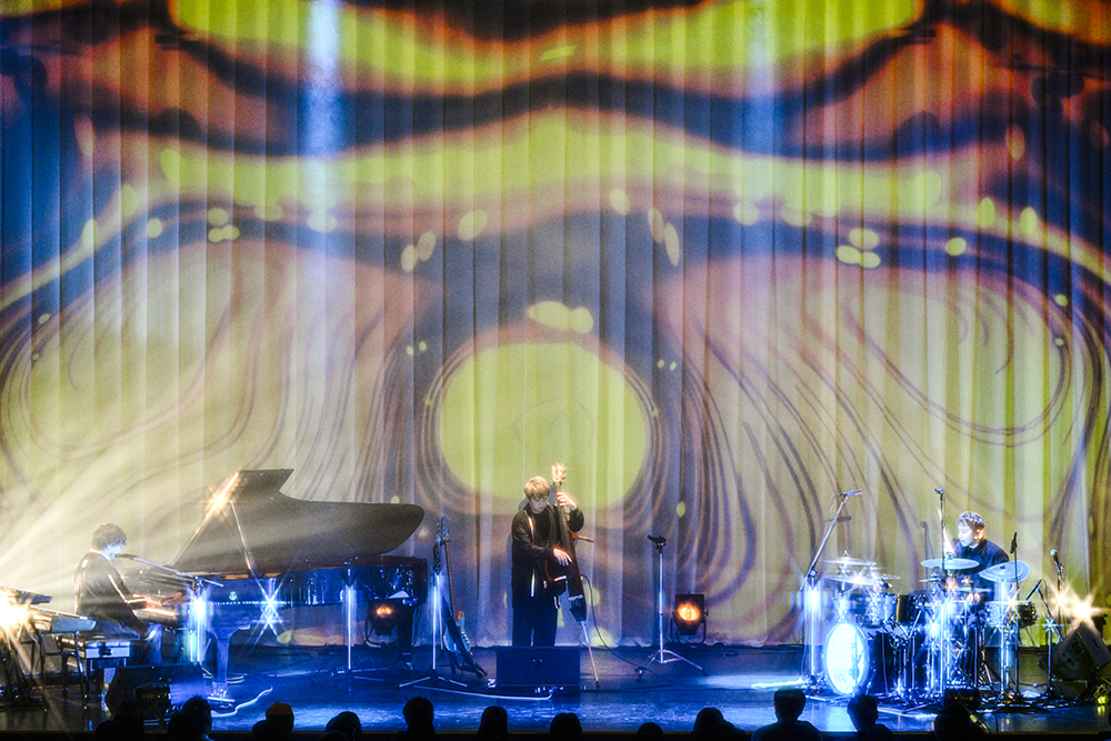 ツアー中で、最大キャパにも関わらずチケットはソールドアウト。満員の観客の熱視線の中、3人は「Deep Inside」「Tokyo」「Step’n」と、アルバムのオープニングを再現しながらぐんぐん飛ばす。彼らをジャズインストだと思っていた人は度肝を抜かれるだろう、激しくロックするリズムを叩き出す井上司(Dr)、ピアノとキーボードとシンセサイザーを駆使してカラフルなメロディを紡ぐ岸本亮(Pf)、中央でどっしり構える司令塔・カワイヒデヒロ(Ba)。この日本橋三井ホールでのライブはほぼ全曲で映像が使われ、今日のように広いステージでは迫力倍増。昨年、TVドラマのメインテーマとして書かれた「アンメット」での、まばゆいバックライトの使い方もかっこいい。耳も目もどっちも楽しい。