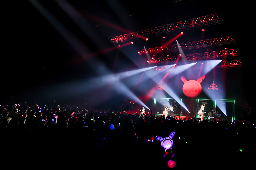 そして、今回の2デイズには終演後に更なるサプライズが用意されていた。ニャッピーアイコンが照明によって妖しく光り、鐘の音が鳴り、不穏な雰囲気の中、ステージに和装で現れたのは今年、MVが公開され、配信もされた謎の覆面バンド、八咫ノ仮面 -YATANO KAMEN-。その正体は直前にメディアで明かされていたため、知っていた人もいたと思うが、ザワつく場内に向かって自己紹介をし、噂のナンバー「祈奉」を投下。ハイトーンからデスボイスまで自在に操るボーカル、地の底まで響くヘヴィなサウンドで圧倒し、最後は無言のまま去っていった。オープニングアクトならぬエンディングアクト? アンカフェのみならず、八咫ノ仮面 -YATANO KAMEN-の今後の動向からも目が離せない。