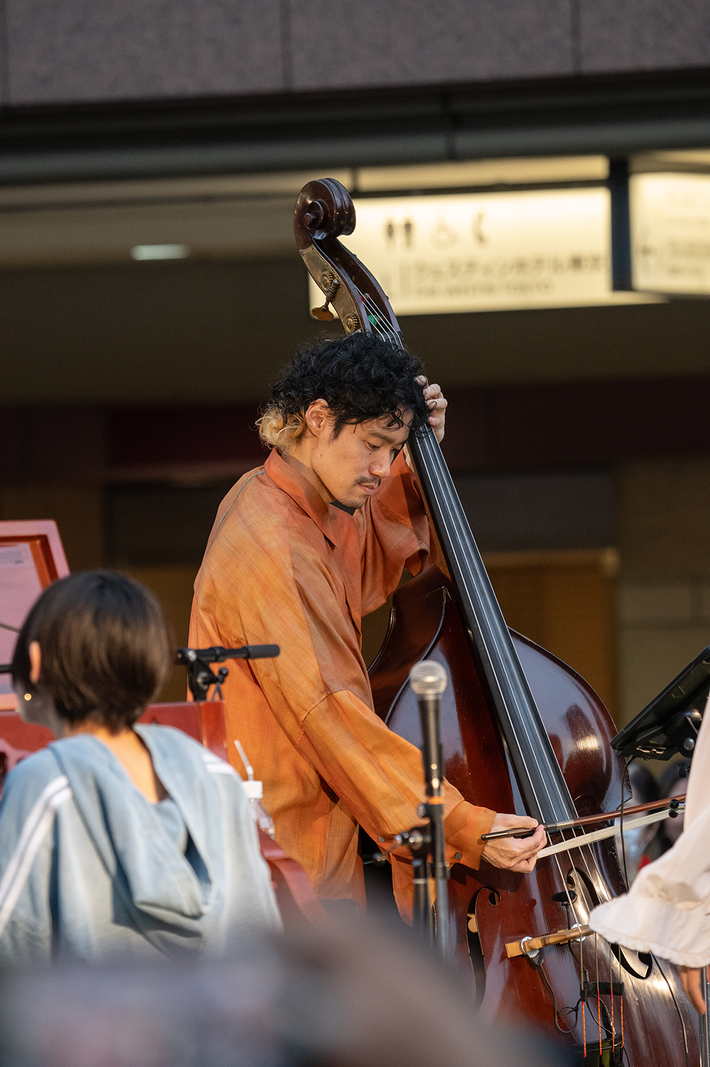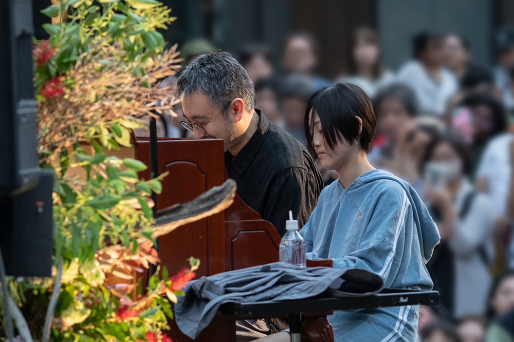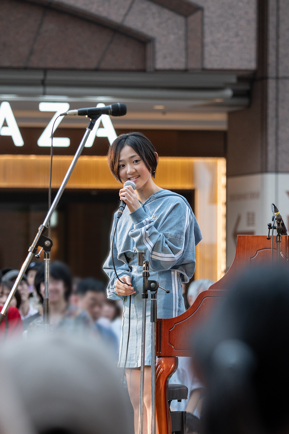 オンステージからオリジナル2曲をソロピアノで演奏。クラシカルな速いパッセージと複雑な展開を持ちながら、そこにしっかりとしたジャズの普遍性が息づいている楽曲は、その演奏だけでなく作曲面でも大器の片鱗を見せる。急遽決まったという海野雅威との連弾では、オスカー・ピーターソンの名曲「Hymn to Freedom」を情感たっぷりに演奏し観客を魅了する。目をつぶれば、演奏者が年端もいかない少女であることが信じられない貫禄のある演奏だ。海野のピアノに入れる合いの手もしっかりと会話になっており、古き良きジャズの心地よい風が恵比寿ガーデンプレイスを通り抜けていく。