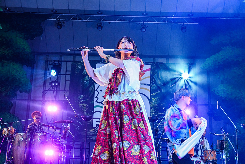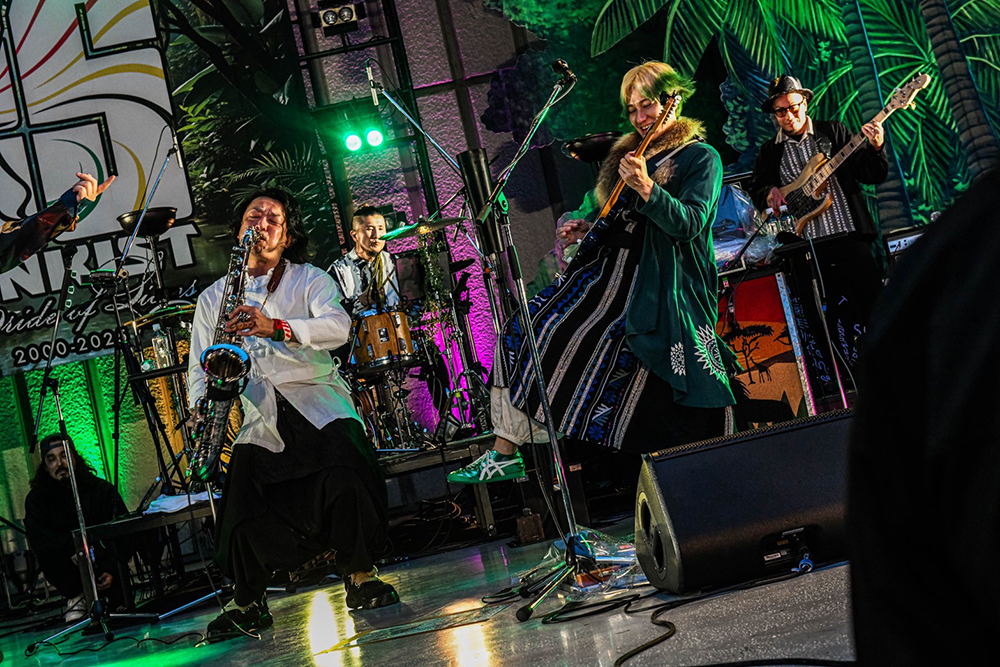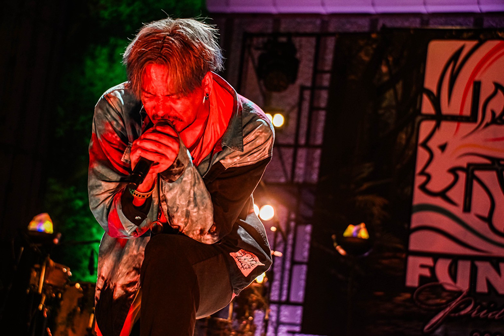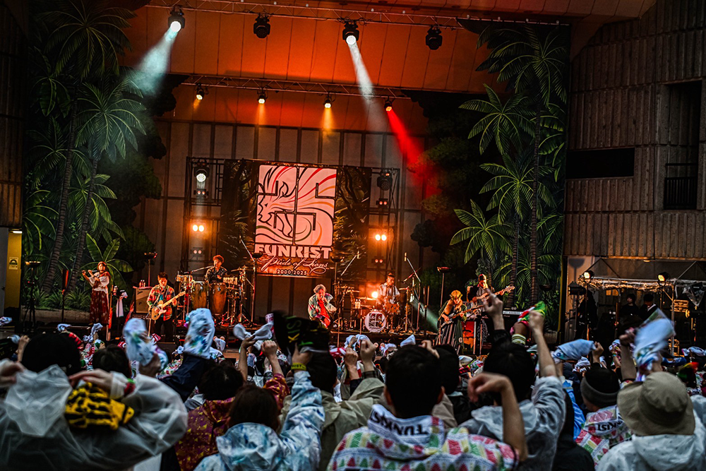 宮田泰治とヨシロウがフラッグを高々と掲げて入場し、染谷西郷が強烈なアカペラ・ラップでパーティーの始まりを告げる。1曲目「BORDER」から振り上げる手と歌声とダンスが客席を埋める。「25年ぶんの音、今日はあなたと鳴らしに来た。全員で歌おうぜ」――フルート・世古美月、パーカッション・kouとドラムス・Yoco(from 二人目のジャイアン)、ベース・Kai(from FREEASY BEATS)の気迫あふれるプレイに、サポートという肩書は要らない。全員がFUNKISTだ。