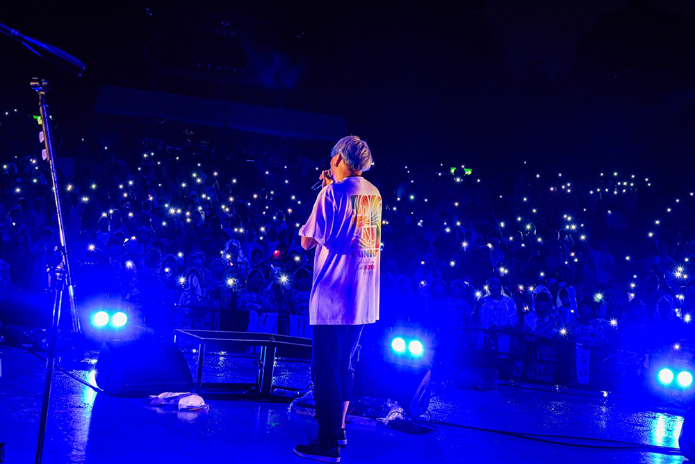 一昨年の大ケガで復帰が危ぶまれたヨシロウも、満面の笑みを浮かべてここにいる。メンバー、スタッフ、ゲストだけじゃない、チケットもぎりのフラチナリズムのモリナオフミ、物販ブースのグッズ販売を担当するケミカル⇄リアクションの3人をはじめ、観客として駆け付けた仲間もたくさんいる。全員を巻き込んだアンコールは、「GLORY DAYS」「Wonderful World」そして最後は「Orion」。客席いっぱいに、スマホのライトが星空のように揺れてる。雨が降るからこそ星空の輝きが胸に沁みる、FUNKISTが雨バンドと呼ばれる理由がすでに歌詞の中にある。