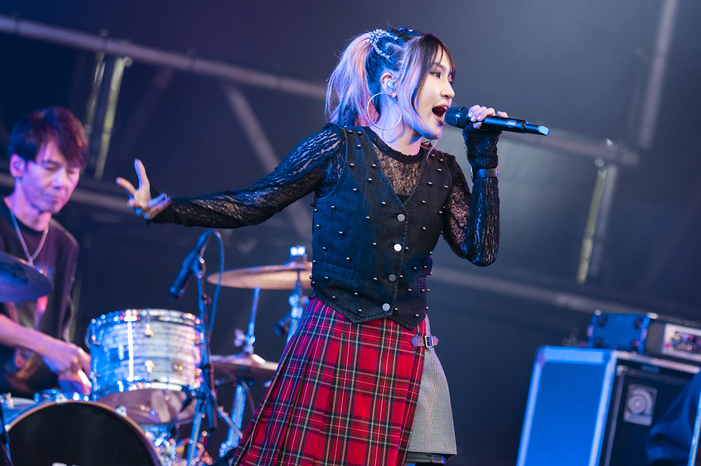 最初のMCでは「米フェスありがとうございます。今日は皆さんに音楽を届けに来たので、とにかく皆さん1人1人に届けていきたいと思います!」と熱い思いを吐露。アップテンポな「世界を蹴飛ばせ!」では上手ステージで、左の脚を高く蹴り上げるアクションも見せ、視線を釘付けにしていた。空をつんざく激しいギターで展開した「FREEDOM~Never End~」では、お立ち台に登って、右手の拳を振り上げながら何度も「FREEDOM!!!」と連呼。照明で真っ赤に染まった舞台で、全身で思いを伝え聴衆を燃え上がらせた。