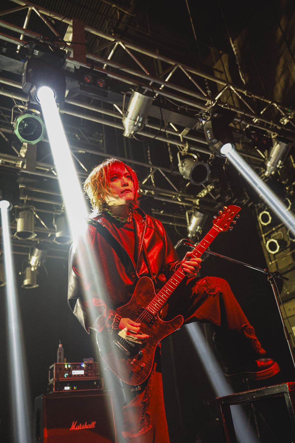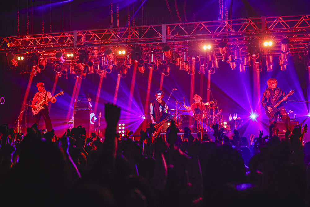 文(Gt)、義(Ba)、啓(Dr)の3人が凄まじい重音を解き放つと、そこへ咲が姿を現し、届けられた1曲目は「愛の地獄」。ヘヴィなミディアムナンバーで一気に深淵まで引きずり込んでいく展開だ。低く降ろされたステージ頭上の照明から、緑色の光が凄まじいスピードで降り注ぎ、フロアではヘッドバンギングが巻き起こる。「躾」では、咲が不気味な声色を切り替えながらフロアを調教するように扇動すると、愛と狂気が紙一重な主人公の心情を表すように曲調が変わっていく「故に、ドエス。」へ。文が奏でる奇怪ながらも耳にこびりついて離れないギターリフと、ヒステリックに叫び散らかす咲のパフォーマンスでフロアを魅了すると、アウトロでは「お前は俺のもんや!」と咲が連呼。そして凄まじい絶叫から「バッド入る」へなだれ込む。感情が昂った啓が立ち上がってフロアを煽れば、義はフロアを見渡し、盤石でありながらも凶暴な音塊を疾駆させていく。流麗なピアノの旋律がダークなサウンドをドラマティックに盛り立てる「堕天」では、咲が2本のマイクを使い分けながら歌を届けていた。