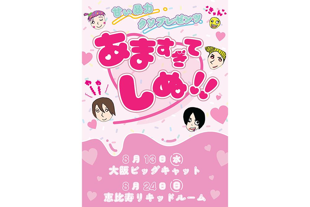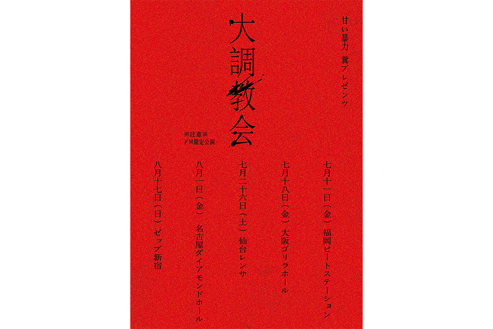 全20本のツアーを締め括ったばかりの甘い暴力だが、ここからも続々と単独公演を開催することが決定している。まずは前述の通り、7月11日(金)から全国5カ所を廻るワンマンツアー『甘い暴力 クソプレゼンツ ドM限定 大調教会』をスタートさせる。それに加えて、8月13日(水)に大阪BIGCAT、8月24日(日)に恵比寿LIQUIDROOMで、『甘い暴力 クソプレゼンツ「あますぎてしぬ!!」』を開催することも発表された。「超凶暴」と「超激甘」という正反対のコンセプトになっていることもあり、それぞれまったく違う内容のステージを楽しむことができるはずだ。さらに、9月3日(水)には、EX THEATER ROPPONGIにて『甘い暴力 プレゼンツ「フェティッシュ」』が開催される。なお、本公演は全席指定のため、まだ彼らのライヴを未体験の方にとって──それこそためらってしまっている二の足を、一歩前に踏み出して──今の甘い暴力を知る絶好の機会でもあると思う。心の闇を引きずり回しながら、限界を突破してく彼らのステージをただひたすらに楽しみにしているし、多くの方々にも体感していただきたい。