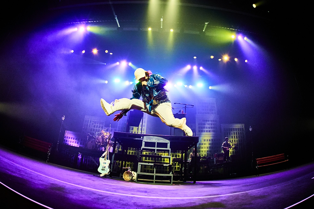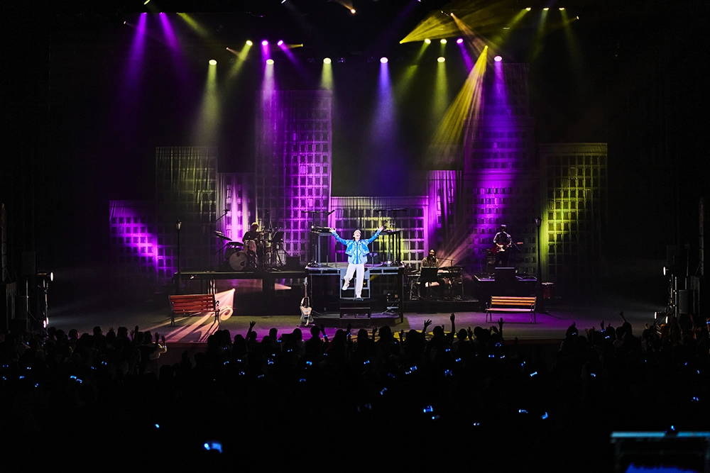 ■なお、ずっとヘッドセットマイクなわけではなくて、スタンドマイクで歌う曲も、ハンドマイクの曲もあり。鍵盤を弾きながら歌う曲や、パッドを叩きまくりながら歌う曲では、当然、ブーム式のマイクスタンドを使う。そう、今回、パッドを叩きまくりながら歌う曲が随所にあって……いや、前のツアーにもあったが、今回その比重が増えていて、サウンドの面でも、見た目においても、ライブ全体の中の効果的なポイントになっていた。エレクトリック・パーカッションとして、パッドを叩くだけでなく、いわゆる鉄琴の役割にして、曲の軸になるリフを叩いて奏でたりもして。