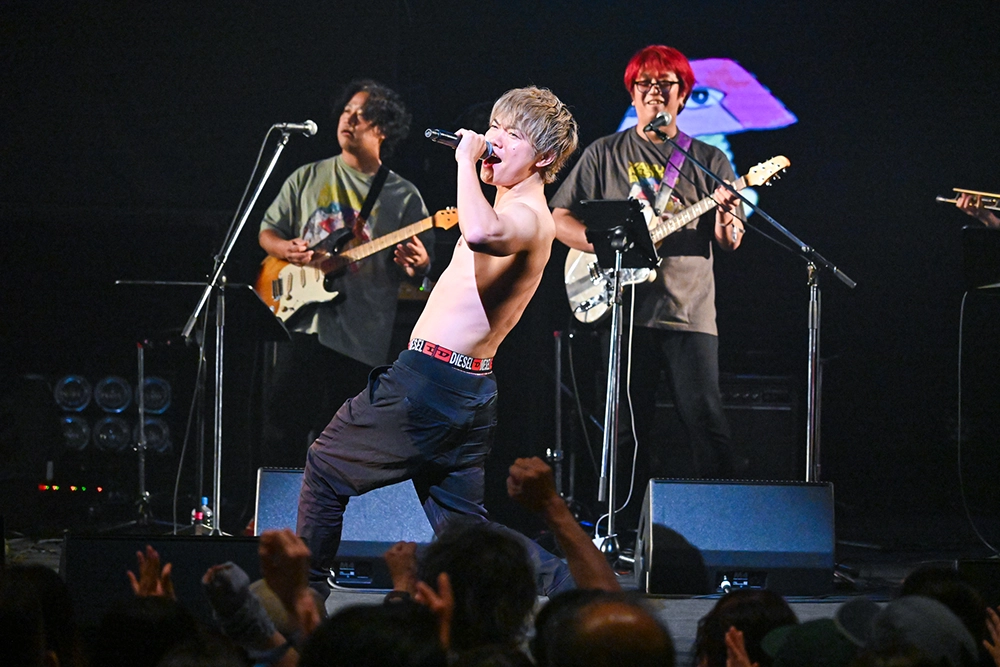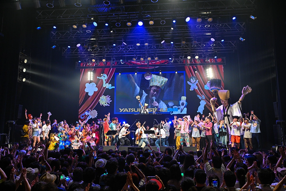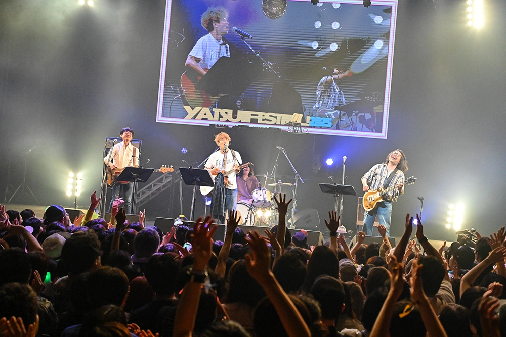 「京都」を歌って「京都アンドレスポンス」で盛り上げ、その「京都アンドレスポンス」が「やついフェスコール」になる。そして後半、「におい将軍」「ダンボール肉まん」「爆弾こわい」「きず」を連発し、めちゃくちゃ盛り上げて終了。アンコールを求める手拍子が止まず、すぐに戻って来て、「みんなが歌える曲を」と「クーポン」を追加した。