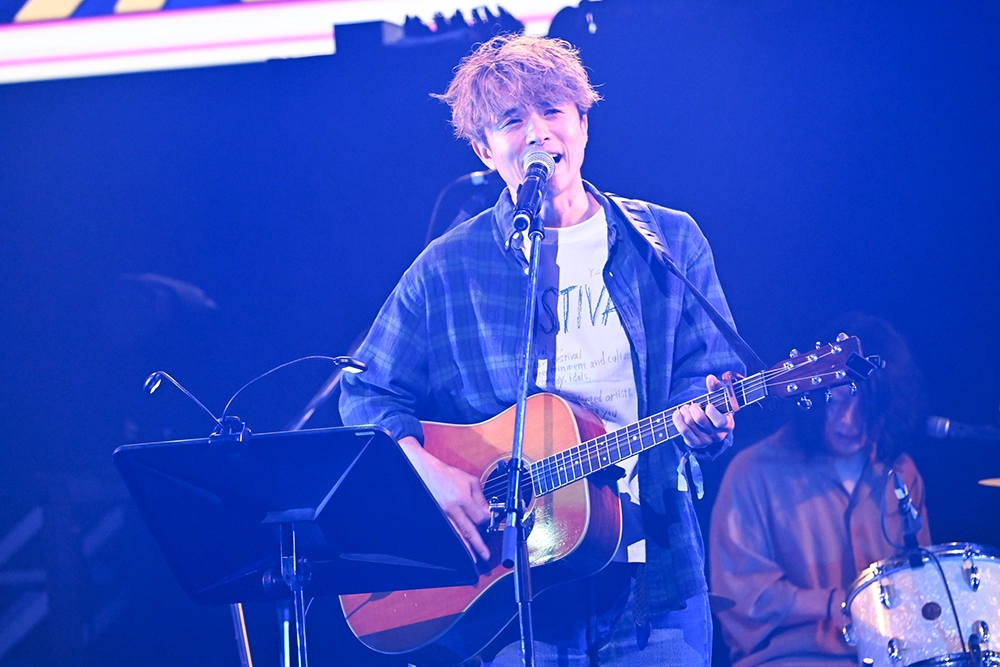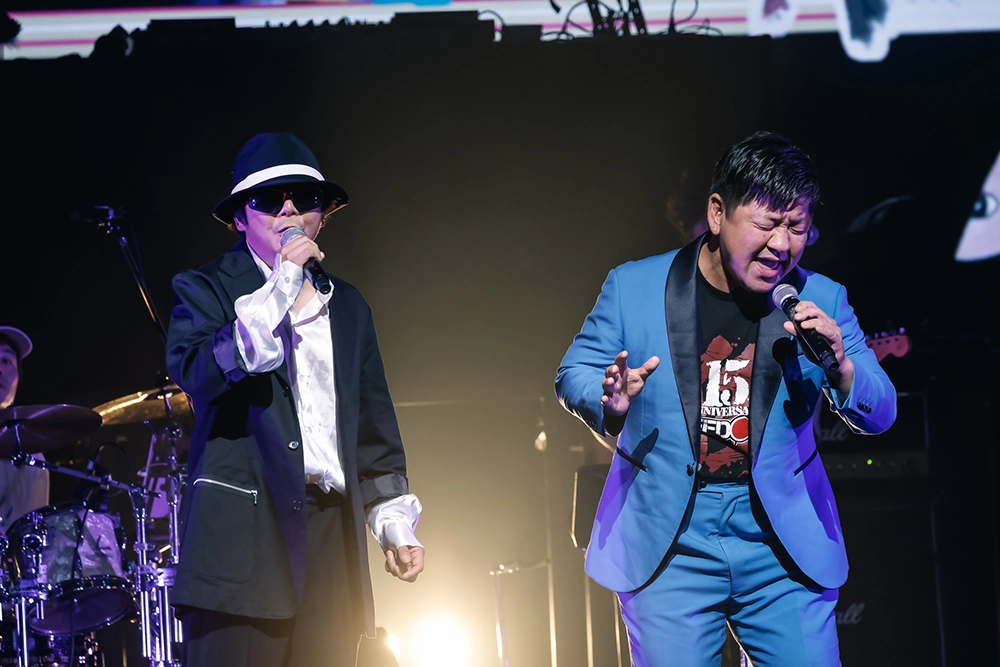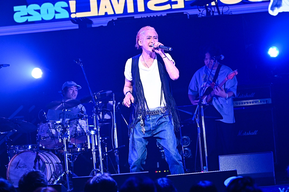 ふたりめは、やついも思わず「なんで出てくれたんでしょう?」と言った大沢樹生。しかも、やつい&堂島と延々としゃべって爆笑をとった末に歌った曲は、なんと「ガラスの十代」。オーディエンス大喜び、大沢樹生のアジテートに応えてシンガロングを返す。