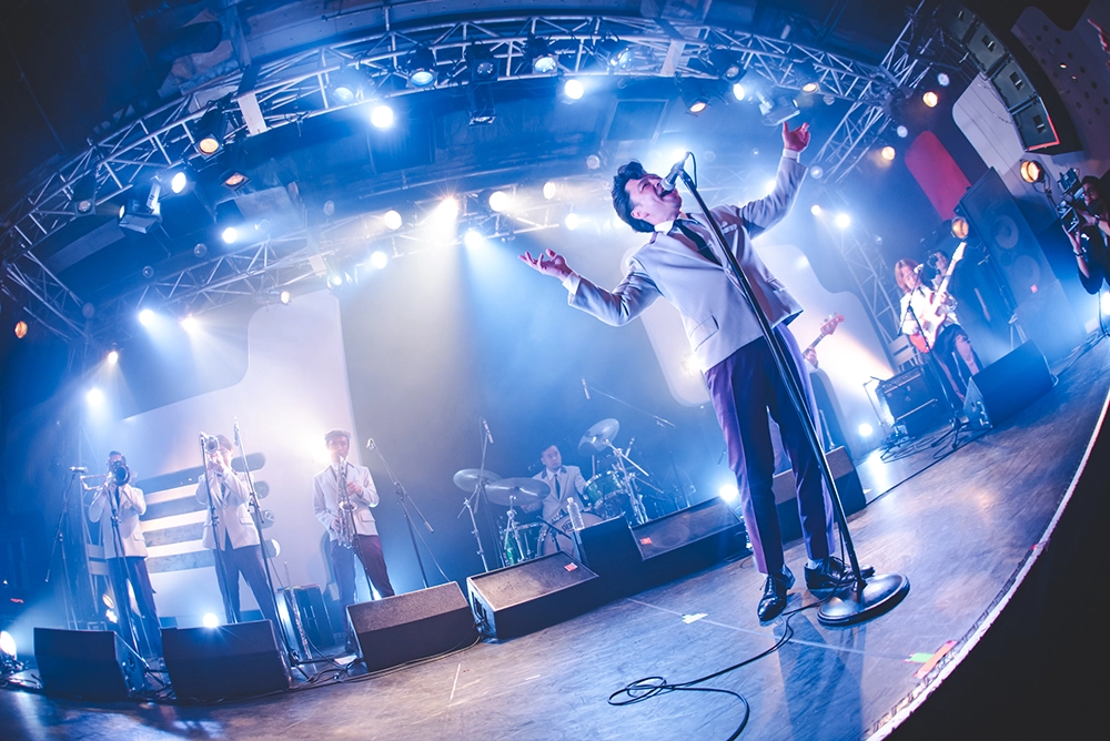 19:40からduoのトリを務めたのは、浜野謙太率いる在日ファンク。「むくみ」、参加者に振付を教えてから「おすし」、「やついフェス二回目!うれしいね、誰も来てくれなかったらどうしようかと思って、トリで」とハマケンが超満員のフロアに喜んでから「環八ファンク」。
