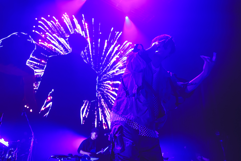 「uni」「アネクメーネ」とボーカルでもってリズムとメロディを巧みに操り、平田義久の楽曲「渇愛論II」で観客にフィンガースナップを求めて情熱的に歌い上げると、スツールに腰掛けてアコースティックセクションへと入る。「Eye」「平均台」と内観的なムードのなか歌詞の世界を丁寧に描き、「誘導灯」で切なくも晴れやかな空間を作り出したあとは一転、「しんみりしたので夏感じませんか?」と梓川がラップと歌詞を担当した平田義久 feat.ゲキヤクの「日本の夏」のカバーを披露した。ラテンと和の要素が融合したサウンドと、湿度を感じる真夏の夜を彷彿とさせる粘度と声量を轟かせると、「友達呼んでいい?」とシンガーソングラッパーのはるみん。を呼び込み全編ラップ曲のエッジとユーモアが効いた「Mont4ge」で観客を煽る。さらにその熱を「相応」で軽やかに発散し、梓川の可動域の広さをあらためて強く印象づけた。