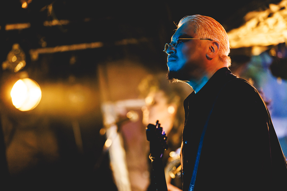 開演直前の強烈なスコールを物ともせず、新宿LOFTは満員御礼。期待に浮き立つ気配が暗転した空間に充満している。一人、また一人とステージ上に登場したメンバーに向けた大きな拍手をアンビエントなシンセがかき消したところで、この日のライヴがスタート。オープニングは作曲が村井、編曲がエンジニアの白石元久という変則コンビによる名品“暗い空、雨音”だ。エレクトロニクスを伴った陰影あるギター・サウンドが、場内を一気に切ないエモーションで満たしていく。