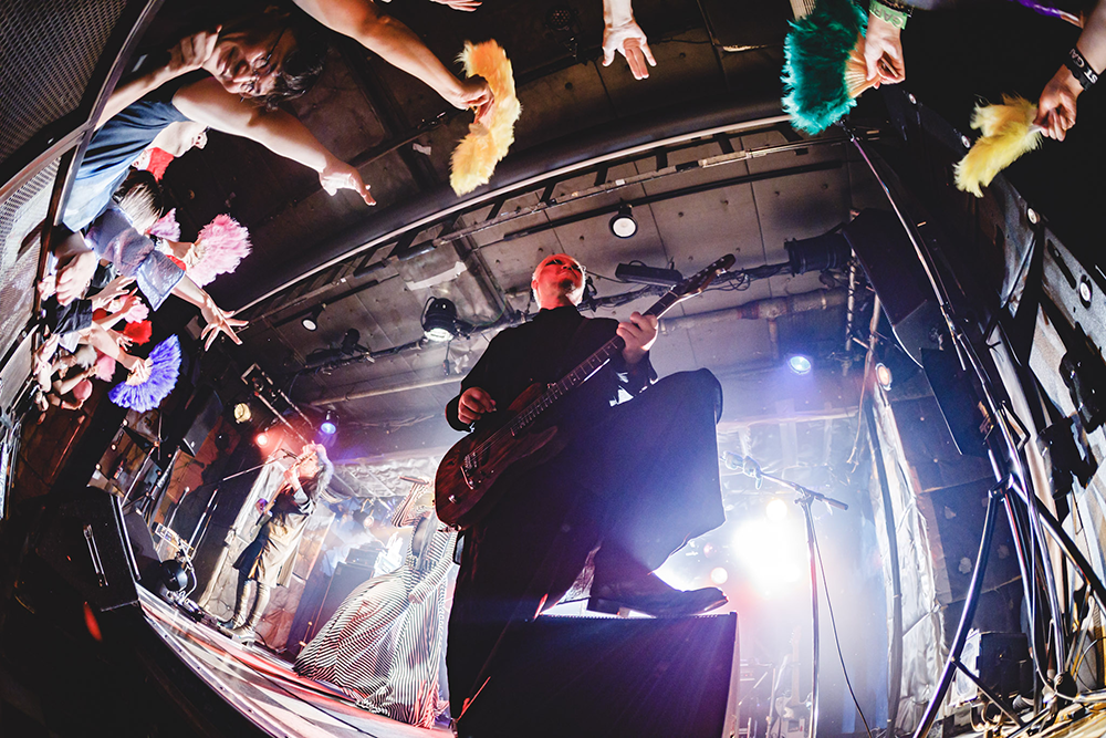 そこから、サポートのササブチヒロシが走らせるパワフルなドラムと桜井の「ロフト行くぞ!」という雄叫びで雪崩れ込んだのは“颯爽たる未来圏”。哀愁ある疾走感に猛烈な感傷を引き摺り出されていると、沈み込むようなベース・ソロが高まった会場のテンションをクールダウンさせ……村井が人差し指を立てた瞬間にスイッチしたのは“ハラショー!めくるめく倒錯”だ。グルーヴィーに刻まれるリフに対し、フロアはキメのクラップでしっかりと応える。滑らかなスピード感のなかに儚いセンチメンタリズムを浮かべる滑り出しの3曲は、あからさまにいつものライヴの〈掴み〉とは異なるもの。cali≠gariは多面性のあるバンドだが、この幕開けからセットリストを考えたファンの好みがなんとなく窺えるような……。