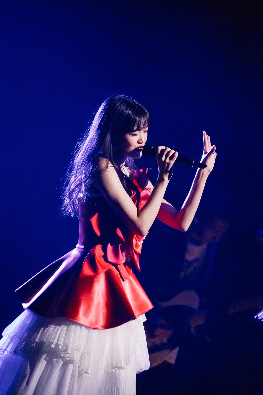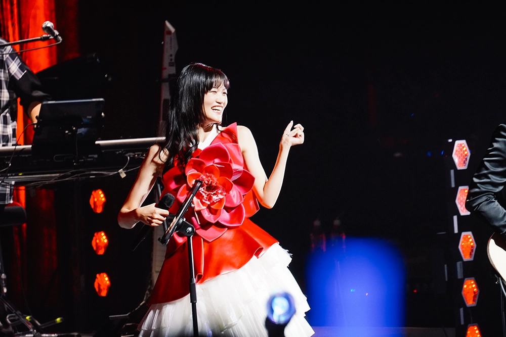 「レイン」「Memory」という今年の「セメライブ」のために作られたライブ用曲を2曲つづけた後、「琥珀糖」はハイチェアに座り、ピアノ伴奏のみで情感を込めて歌い、三日月と星空をバックに歌った「glimmer」でスクリーンに流れ星が流れ、光が差す新たな日に導く“生命の歌”である「Tear of Will」では一転して壮大なスケール感を表現。5曲続けての“バラード”は、様々な種類があり、多様な表現があることを再認識させられた想いがした。