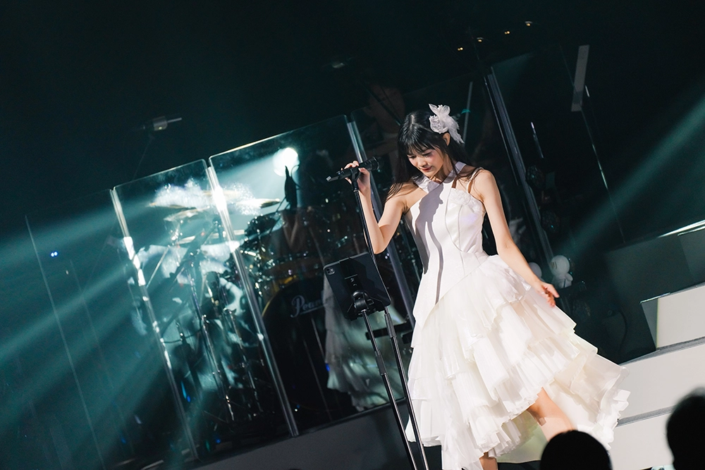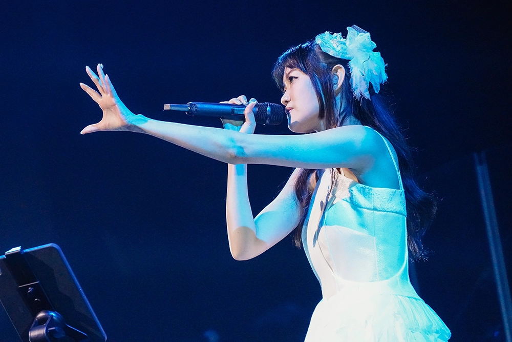 さらに、1曲の中でバウンシーなバブルガム・ソウルポップから高温でしっかりと歌い上げるミュージカルナンバーへと変化する「PLACE」、80年代の歌謡曲ムードたっぷりの「夢の果てまで」を経て、「フロレセンス」では表情が見えないほど照明の落ちたステージで、ダークで深みのある歌声を響かせると、心の声が漏れたかのようなセリフや激しい息遣いで観客を楽曲の世界観にグッと引き込み、さらに重厚になった「祝福」と「Abyss」は彼女のアカペラによる<君に>というフレーズでシームレスに繋ぎ、狂おしいほどの思いの奔流をエモーショナルに歌唱。静から動、光から闇、ウィスパーからストロングという一連の流れはダイナミズムに溢れており、早見のヴォーカル表現の多彩さをじっくりと堪能できる時間となっていた。