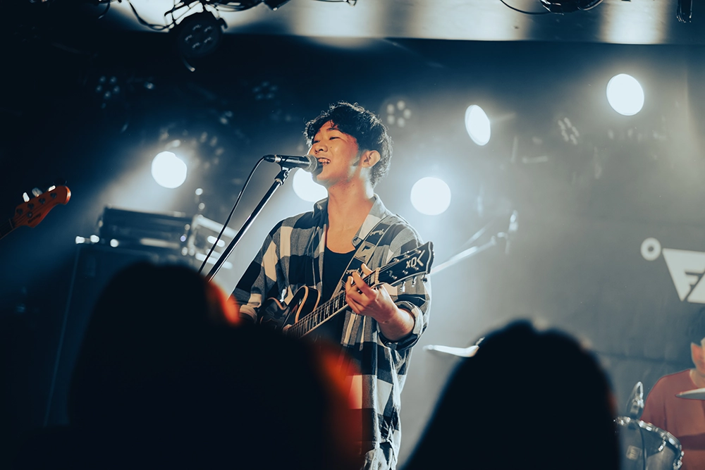 この日のトッパーはおもかげ。ひぐまかんた(Vo&Gt)がポロンとギターを鳴らし、一瞬の静寂からウェットな声を響かせて聴く者の心を掴むと、彼らの代表曲「ラベンダー」で本格スタート。力強く丁寧な演奏と甘く切ない歌声で会場を包み込む。