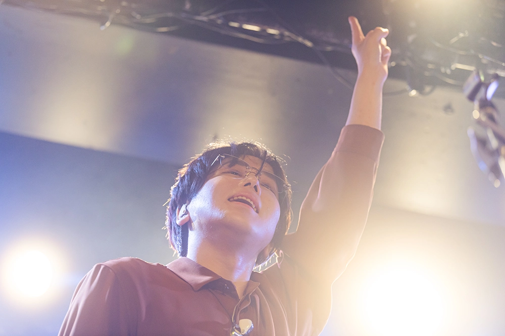 Broken my toyboxのジャンルの枠にとらわれないカラフルな世界観に、まるでテーマパークに飛び込んだようだなと思っていると、「初めての方も一緒に盛り上がってくれますか?」の声にオーディエンスが手拍子を合わせて始まった楽曲は「桃源郷へようこそ」。そうか、ここはテーマパークじゃなくて桃源郷だったか! キラキラ光るミラーボールの下で<桃源郷 ようこそ皆様>と歌う藤井に、桃源郷では全部気持ちを委ねて、仰せのままに心のままに歌って踊るのが正解なのだと理解する。