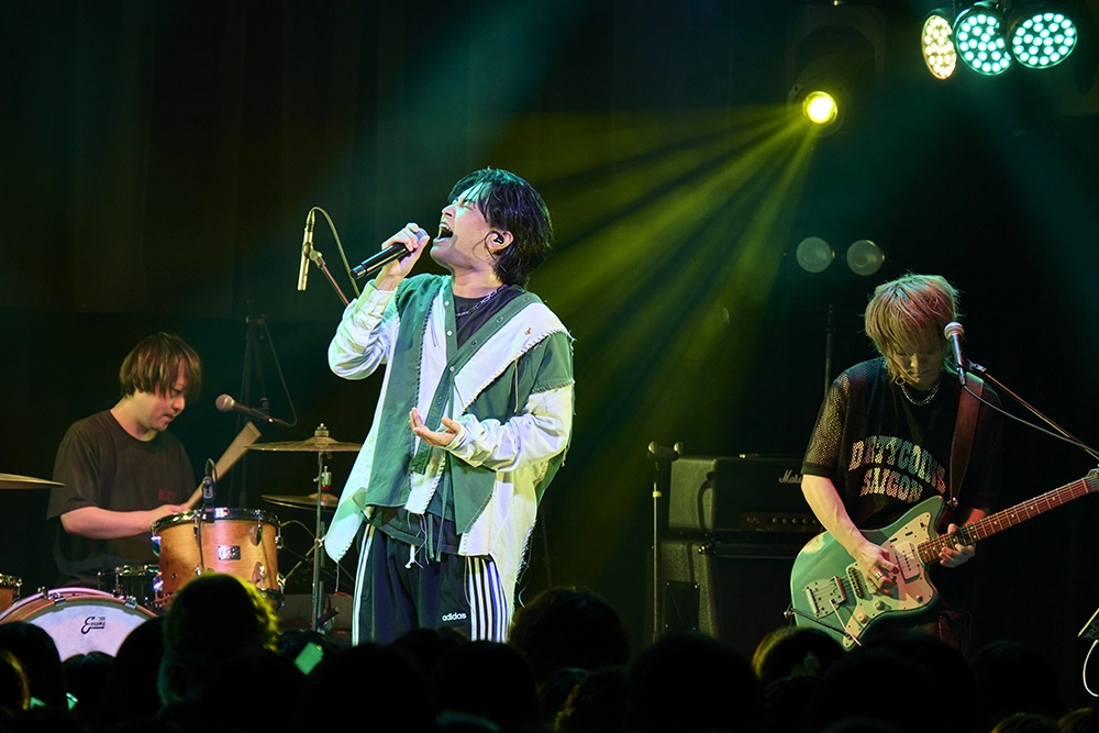 えるのは久しぶりのステージに「まだライブをしている実感がない」とどこか浮ついた様子を素直に明かす。すし詰めのフロアを慮ると「最後まで盛り上がっていきましょう!」と告げて「ヘッジホッグ」へ。アンニュイなムードや軽快なラップ、感情を込めて張り上げる歌唱など、多彩なボーカルで観客の意識を引きつける。「初恋日記」では耽美なムードで包み込み、「一緒に手拍子で盛り上げてくれたらうれしい」と呼びかけた「シュガー」は、センチメンタルでポップなサウンドに彼のファルセットがよく映えていた。
