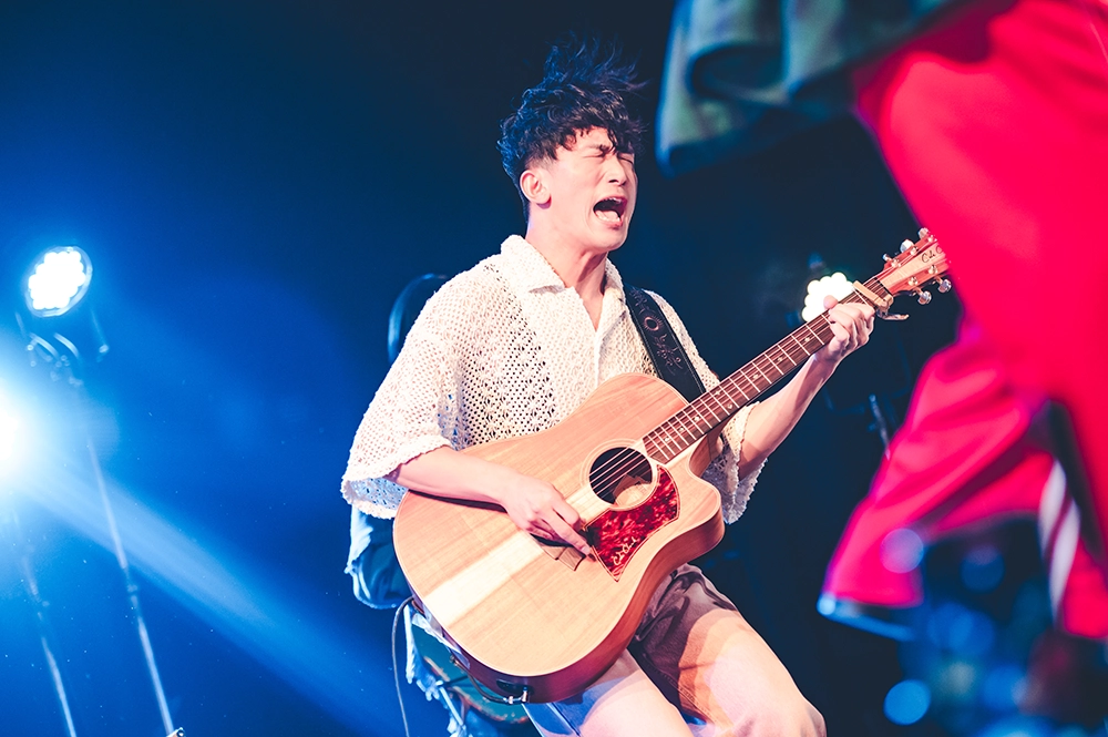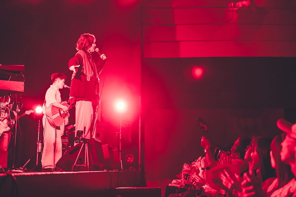 HONEBONEの2人のドキュメンタリー・タッチのオープニング映像に続いて始まったのは、10月15日リリースの新曲「やっても歌」だった。ハンドクラップの中、タイトなバンドサウンドに乗って、EMILYがハンドマイクを持って歌い、KAWAGUCHIが足でリズムを取りながらギターを奏でていた。ダイナミックなバンド演奏の中での歌声が新鮮に響いた。この曲は失敗、すなわち“やってもうたこと”が描かれた歌で<言葉を間違えた>という歌詞があるが、なんとEMILYが実際に歌詞を間違える場面もあった。だが、この日のライブのタイトルは 「人生まるごと全肯定!!」であり、人生に失敗はつきものだから、まったく問題ない。「そういう歌だから。歌詞を間違えますよっていう歌だから」とKAWAGUCHIがナイス・フォロー。2曲目の「満月こわい」では観客も一体になってのシンガロングとなり、早くも会場内に熱気が漂った。
