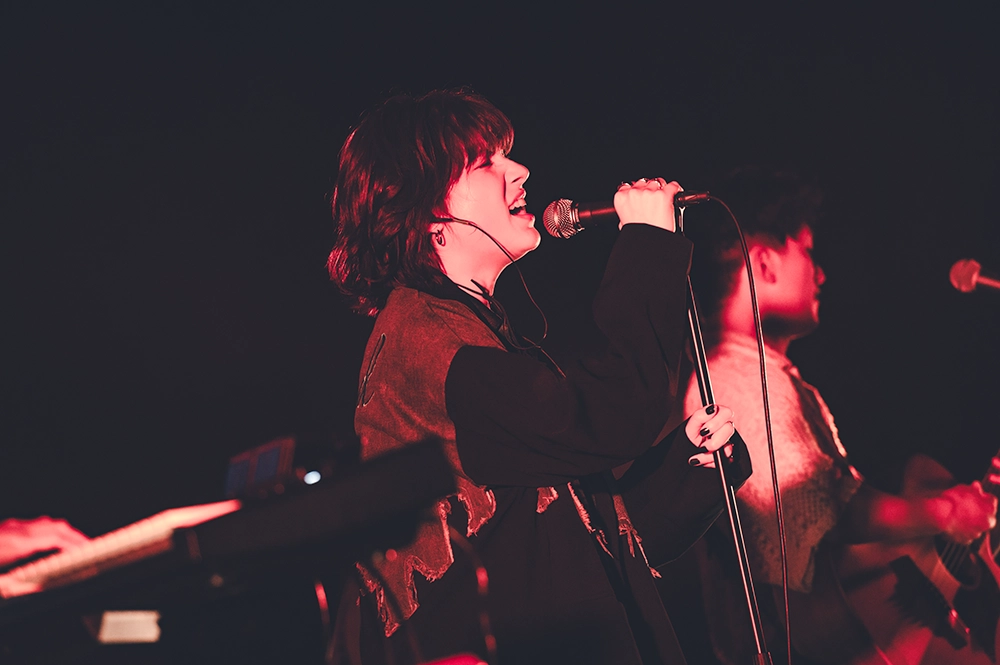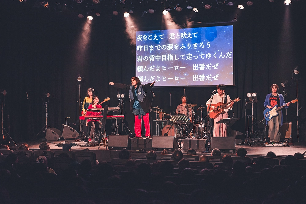 涙と笑いが交互に起こる“喜怒哀楽のジェットコースター”と形容したくなるコンサートとなった。渋谷Pleasure Pleasureで開催された『HONEBONE ホールワンマンライブ2025 「人生まるごと全肯定!!」』。2人だけのコーナーもあったが、基本的にはバンドスタイルでのステージで、メンバーはEMILY(ボーカル)とKAWAGUCHI(ギターとコーラス)というHONEBONEの2人に、スーパーさったん(エレキギター)、木下きえ(ベース)、野口紗依子(キーボード)、脇山広介(ドラム)を加えた6人編成だ。