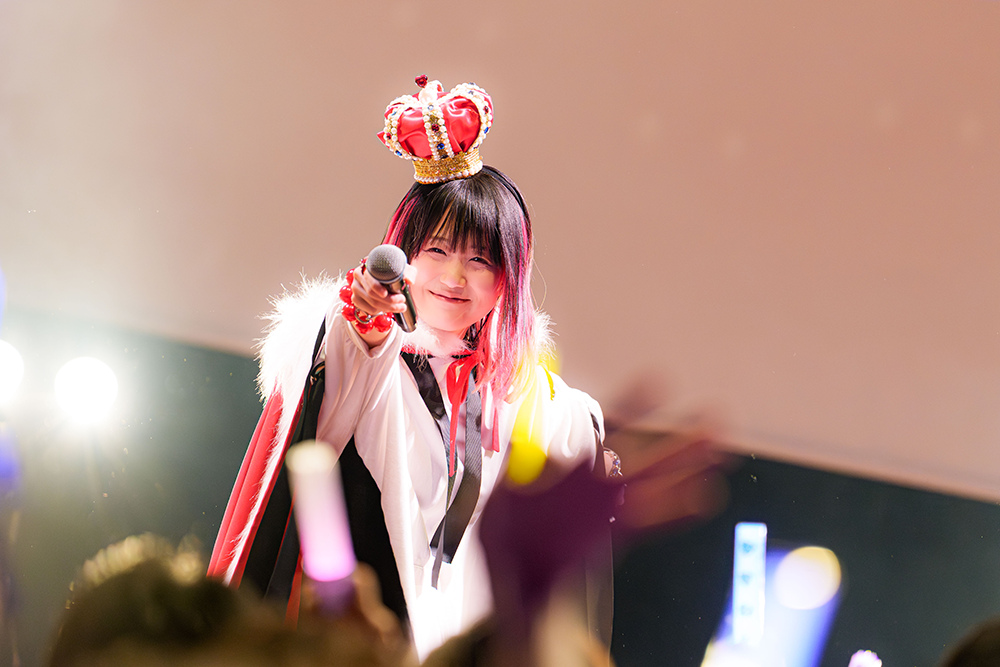 とくみくすがステージから去り、単身残ったなすお☆は最新オリジナル曲「人狼ゲームの歌」、TVアニメのオープニングテーマ「メリーゴーランドタイム」「ハニージェットコースター」とアッパーでパワフルな楽曲をたたみかけて会場を大いに沸かし、観客も全力のコールでそれに応える。終盤では歌いながらサインボールを投げ込み、華々しい空間が広がった。