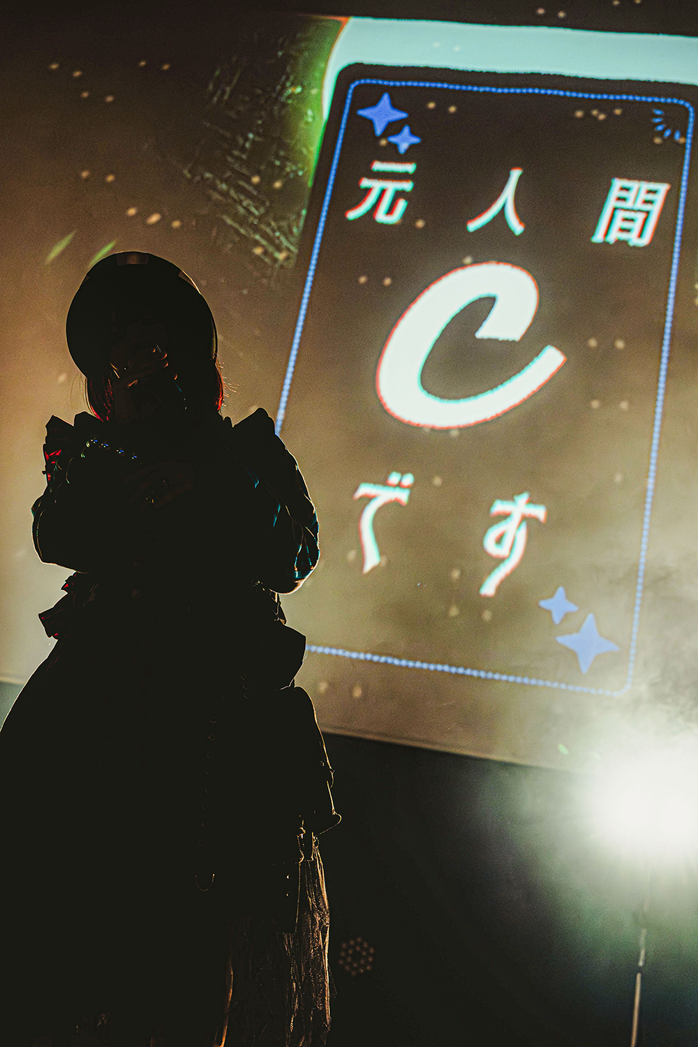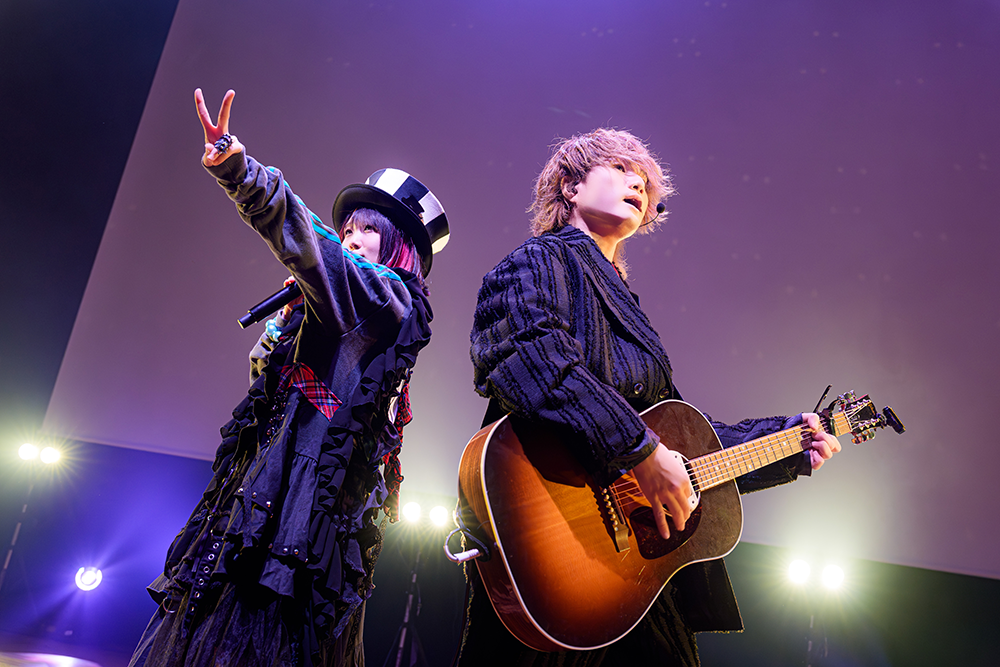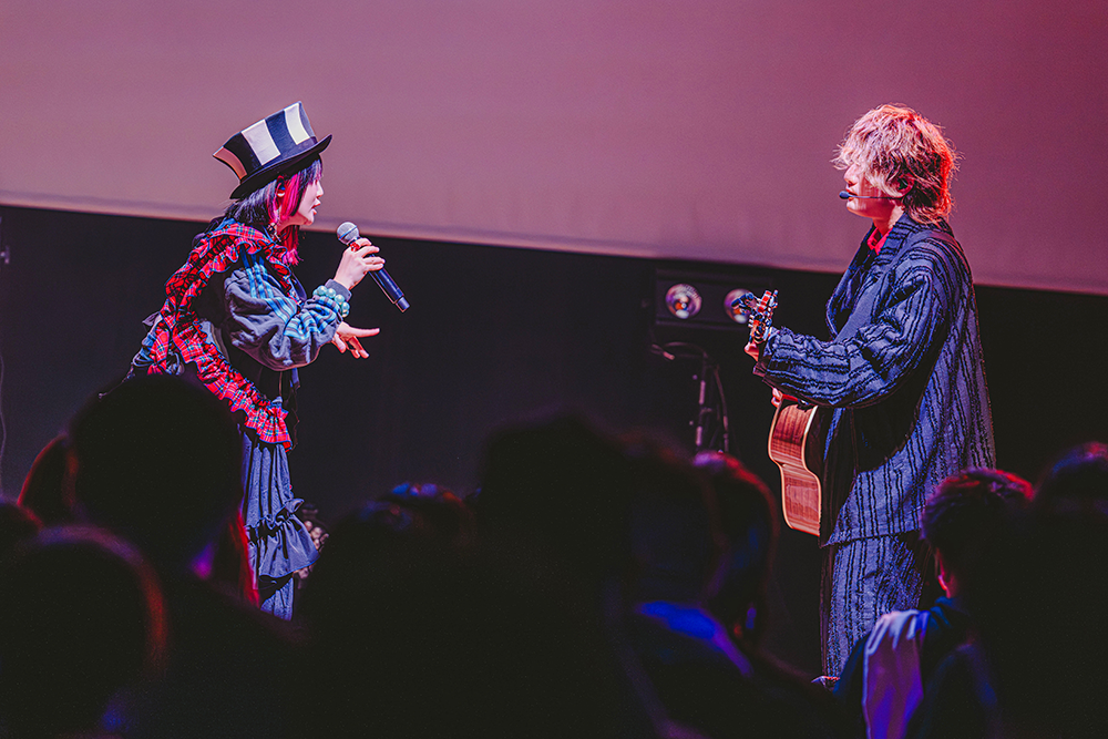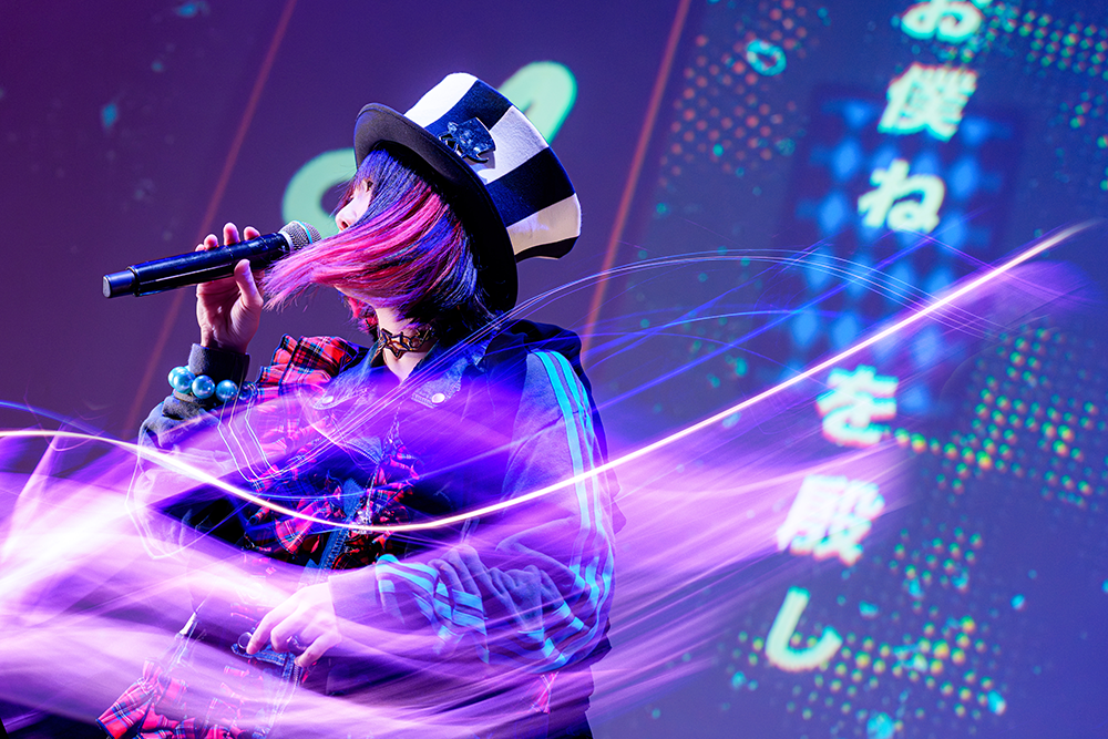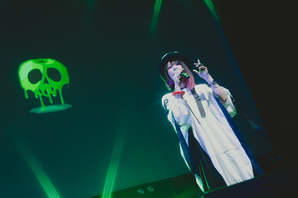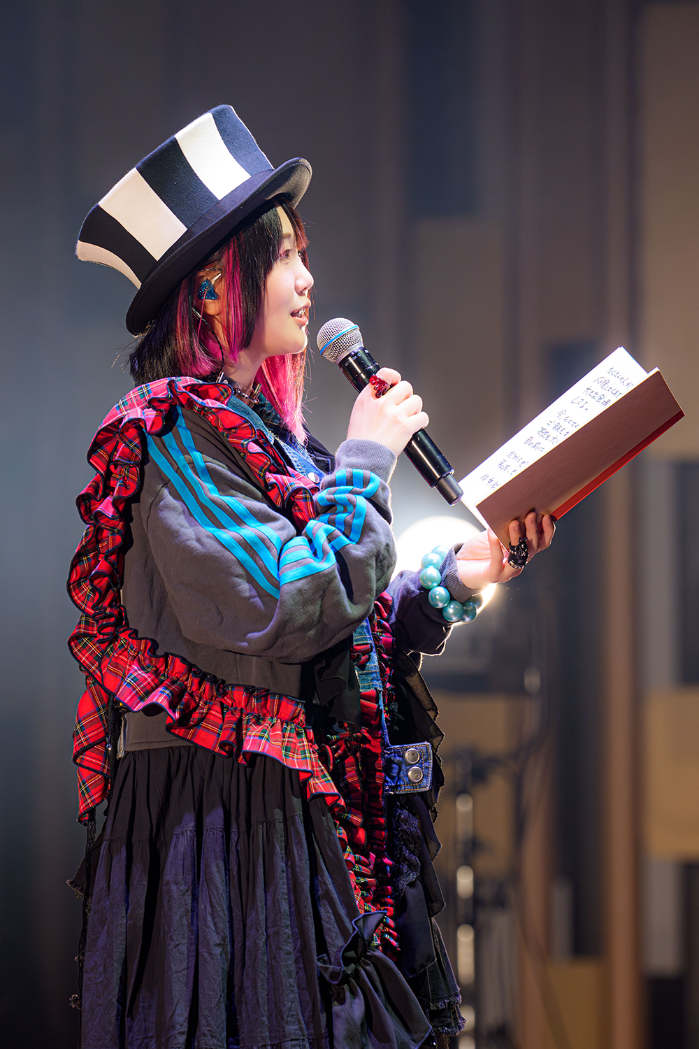 男の子目線の恋心を歌った「王子様症候群」で観客とともにタオルを回し、キュートかつ頼もしさを感じさせる歌声を響かせた後は、「いままでYouTubeで歌ってきた曲や、この10年で作ってきた大切なオリジナル曲、大好きな音楽をいっぱい届けたいと思います」と高らかに宣言し、衣装チェンジをして2023年に公開した「転生林檎(白雪姫目線替え歌)」を歌唱する。緊迫感のあるミステリアスなボーカルで観客を歌詞の世界に引き込むと、ステージバックのモニターに絵本が映し出され、初期オリジナル曲の「うそつきピエロ」へ。絵本と紙芝居をブレンドしたミュージックビデオの再解釈とも言える演出と、ひたむきな気持ちが伝わる歌声に、観客も優しくペンライトを左右に揺らした。