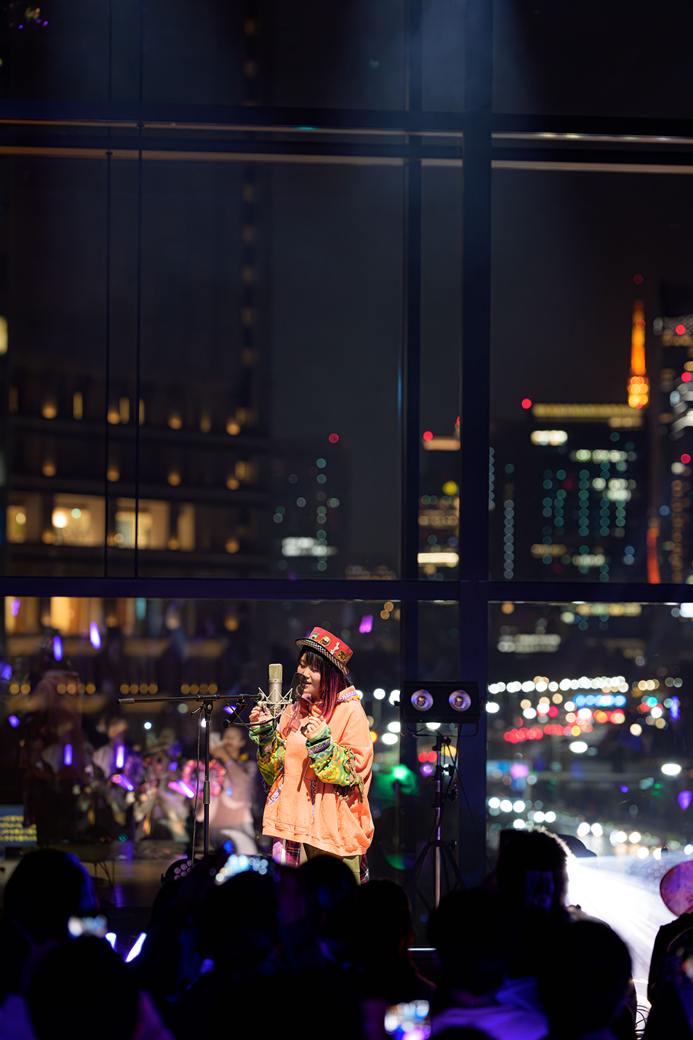 アンコールを求める観客の「ハニージェットコースター」の合唱に導かれるようにステージに再びなすお☆が登場すると、バックの暗幕が開き、ガラス壁の向こうに東京の夜景が広がる。それを背景にしてコンデンサーマイクの前で歌うという演出で、「115万キロのフィルム(10年後ver.替え歌)」のアコースティックアレンジカバーを届けた。YouTubeのカバー動画と実際のライブステージ、東京という街の3つの要素が合わさった環境は、10周年ならではのプレミアムな光景だった。