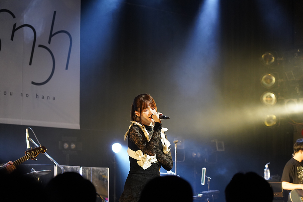 するとここで、この日のゲスト・岬なこをステージへと招き入れる。今年sanaが岬へ歌詞を提供し、岬のデビューアルバムではsajou no hanaのメンバーでもあった音楽プロデューサーの渡辺翔が岬に楽曲提供をするなど、sanaと岬は接点が多い。sajou no hanaのワンマンライブでゲストを招くのは初であると明かしたsanaに、岬は「ずっとsajou no hanaのライブに行きたいと思ってたけどなかなかタイミングが合わなくて、初参加がステージの上になっちゃった」と返して会場を笑わせる。そしてsanaは「このツアーでカバーしていたなこちゃんの楽曲を一緒に歌いたい」と切り出し、ナノウが岬に提供した「HURRAY!」をふたりで歌唱した。可憐な歌声で瑞々しいミドルナンバーを彩る様子は、ふたつの花が揺れるのを眺めるように心あたたまるものだった。