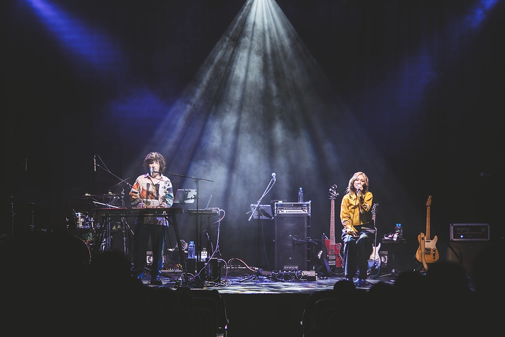 みゆうののびやかかつ透き通った歌声と、コーラスで寄り添う陽介のハーモニーが、タイトルどおり会場を彩っていく。最初は少し緊張感が漂っていたものの、アップテンポなサウンドにオーディエンスも手拍子で応え、すぐに会場は温かな雰囲気に。「愛は止まらない」「花とあなた」とリーブル印のポップスを届けながら、ふたりの顔も綻んでいった。