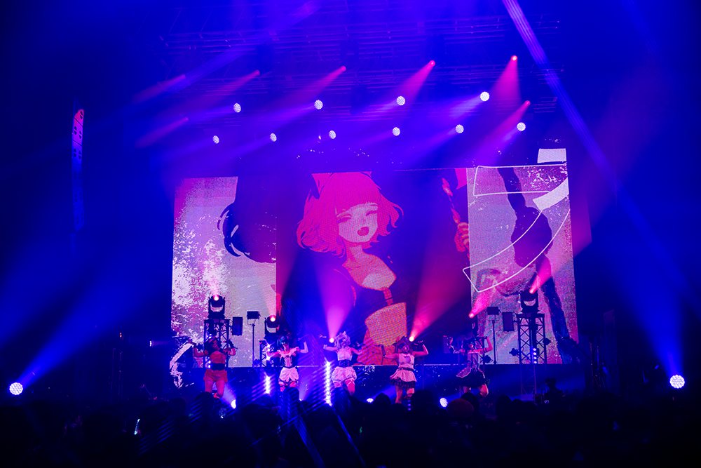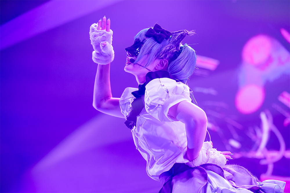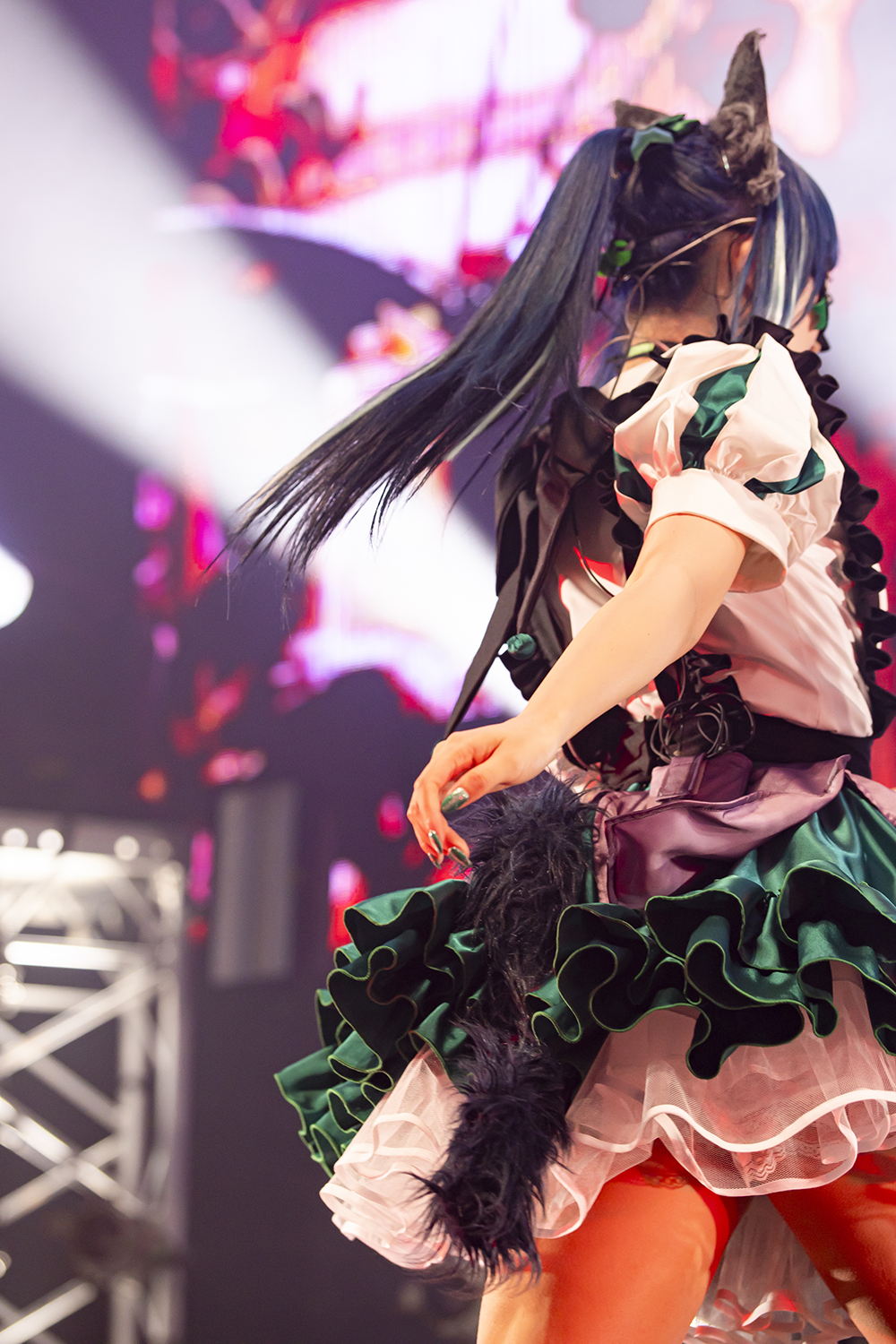 1番手のCHINOは「I.C.E」「DRESS.」「Memoria」と静と動をテーマに、楽曲の物語性を表現する。マイクスタンドを用いたパフォーマンスも行い、低音ボーカルも活かしてダークかつファンタジックな世界を作った。NEFFYは「猫好的トリックスター」「猫好的ショータイム」「Eyes On Me」と彼女の無邪気さとアダルティな魅力の両方を届ける。観客にも溌溂と呼び掛け、会場を沸かした。RARAは「禁断果実」「月輪迷宮」「JUICE」と甘く毒々しい、不気味な世界を追求する。緩急の効いたボーカルとダンスは、こちらを捕獲してしまうような迫力に溢れていた。