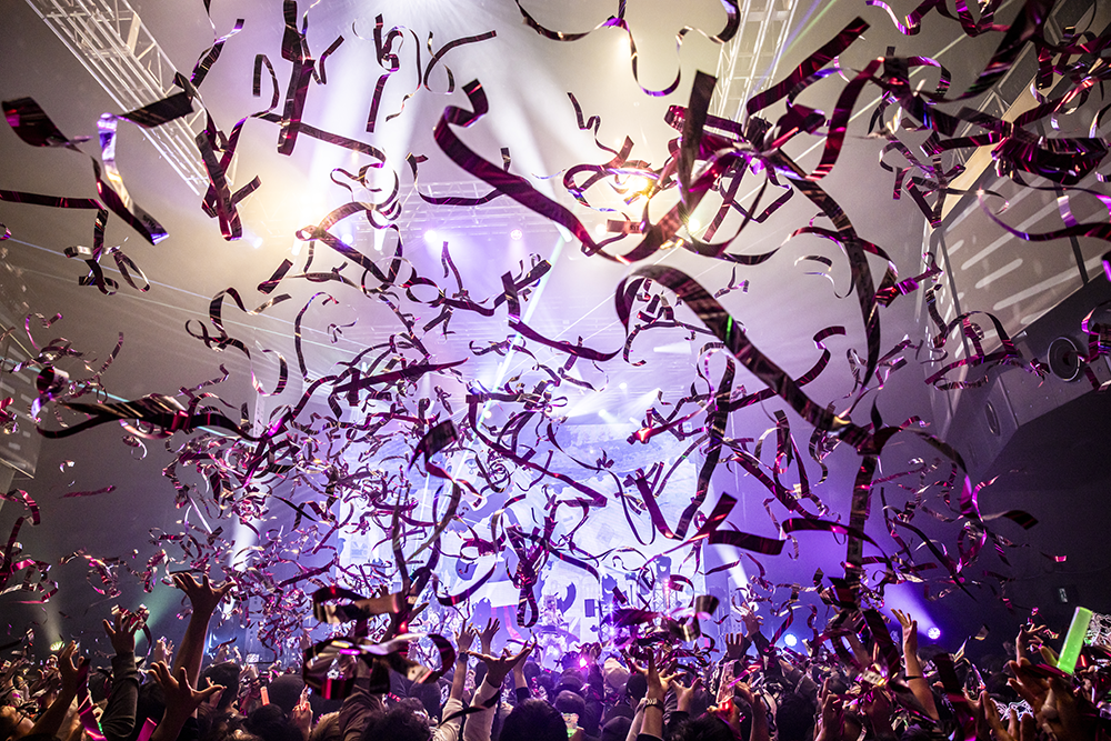 フロアから「ありがとう!」の声が次々と湧き起こるなか、ミラーボールの光に照らされて「再構成ウィーバー」を歌い出すと、観客もコールとシンガロングを送る。5人も希望に満ちた歌声で楽曲を染め上げ、ラスサビで噴射された銀テープもハッピーでポジティブなムードを増幅させた。ラストに5人が手をつないで高く掲げる姿もとてもシンボリックだ。