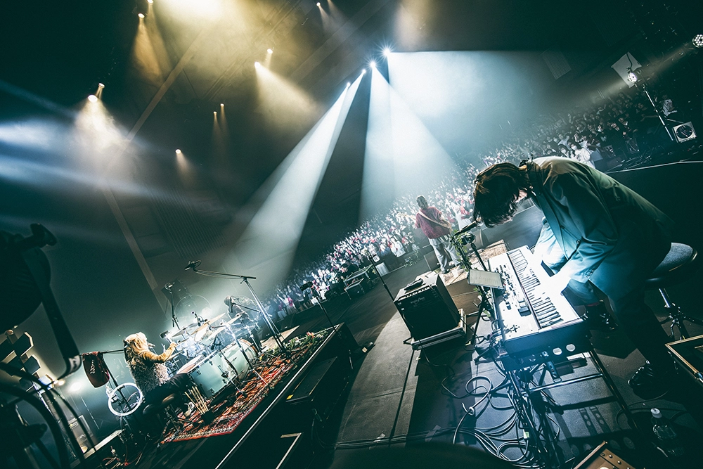 頼れるサポートキーボード、マツジュンこと松本ジュンを紹介して、たくがアコースティックギターに持ち替えて歌う「陽だまり」は、明るく楽しいカントリーロック風。センチメンタルなバラード「あのさ」から、激しくラウドなロックパートをはさんで「図星」へ繋ぐ、楽曲の流れにライブならではの工夫が見える。たく、たなかりがお立ち台に駆け上がって観客を煽り、「歌えるパートは一緒に!」(たく)と呼びかける。みんな一緒に盛り上がりたい、3人の思いは一つだ。