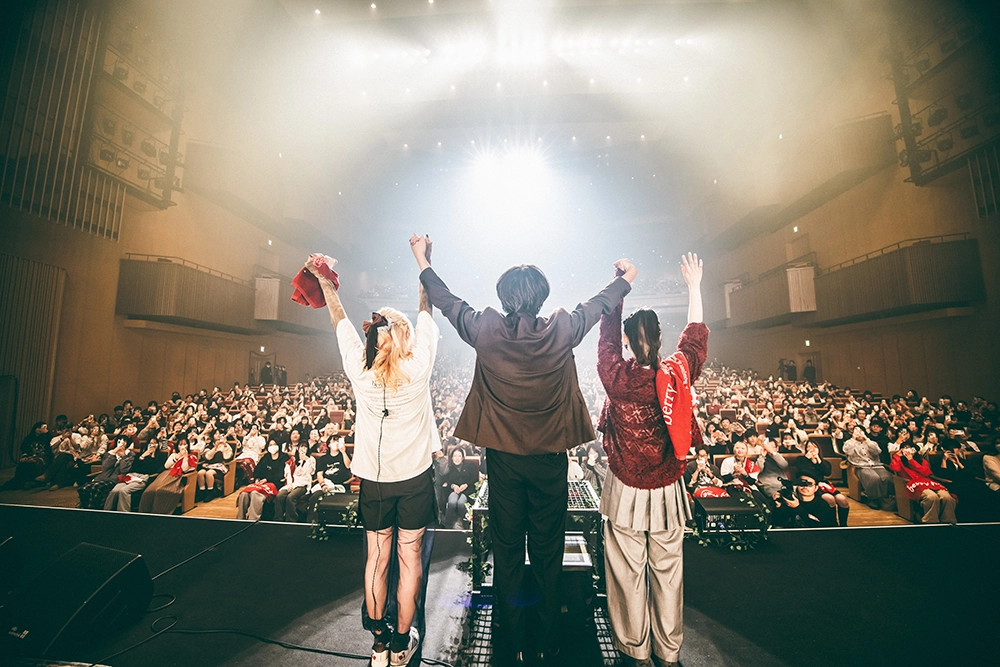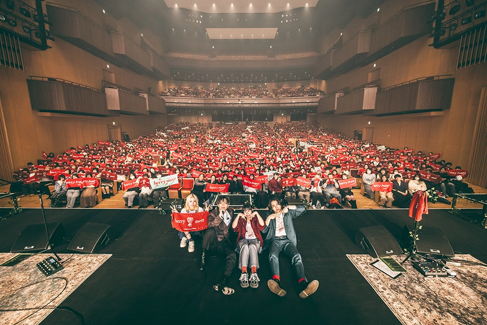 ここで嬉しいお知らせ、「オフィシャルファンクラブ『berry meet TOWN』開設」と「4月から全国ツアー『Daylight』決定」の二大ニュースに、湧き起こる拍手と歓声。過去最高の15本、そして東京公演は未発表なので、またすぐに良いニュースが届くはずだ。次のツアーでの再会を約束する最後の曲、「溺愛」は客席を三つに分けてコーラス合戦で盛り上げて、フィナーレは明るく元気に心一つに。記念写真に収まる3人の笑顔がまぶしい、berry meetは今が劇的成長期まっただなか。どこまで伸びていくのか、目を離している隙は1秒もない。