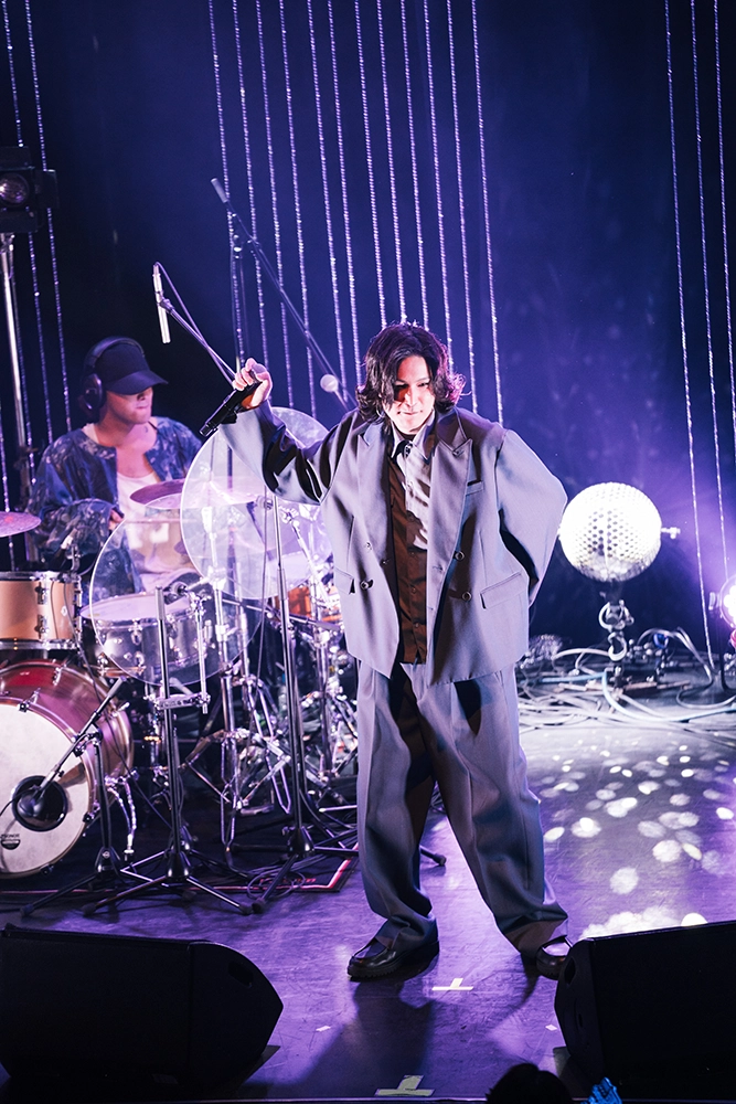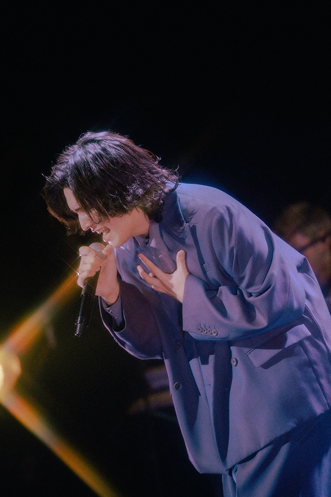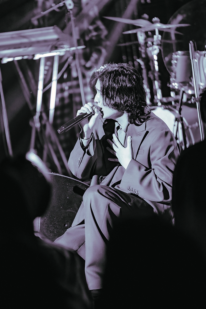 バンドが演奏を始め、誰もがステージを見つめる中、いきなり一階席のど真ん中に現れて大歓声を浴びる。驚きの演出で観客のハートをがっちりつかみ、ゆっくりとステージに上がる。曲は「無口な涙」。180センチの長身を青みがかったソフトスーツで包み、バラードを歌う姿に華がある。音源よりはるかにエモーショナルな歌い方だ。