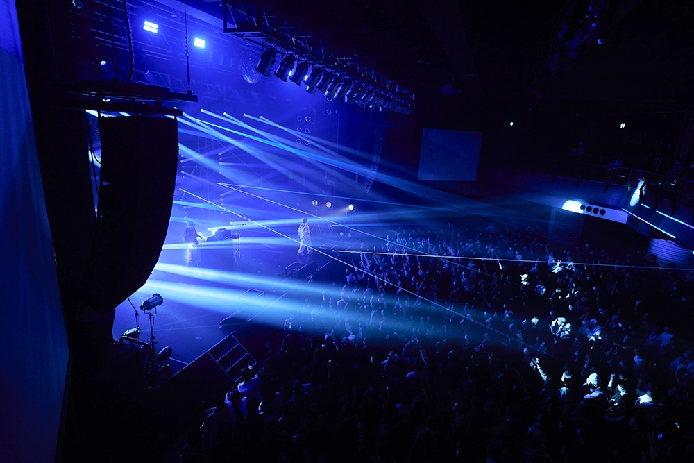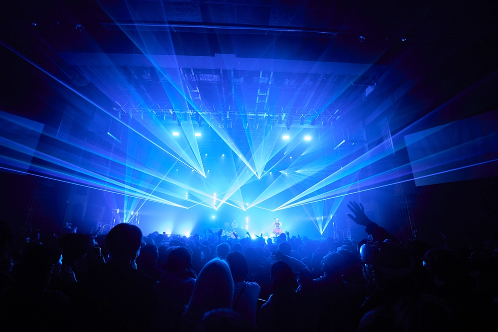 イベントの最後を飾ったのはtofubeats。「私のライブ、ノンストップなので最初に言いたいこと言いますね。huez15周年おめでとうございます! 僕らなんて、照明と映像がなければただのおじさんなんで(笑)。今日はhuezの照明だけでも楽しんでください!」という愛と自虐が込められたMCを放ち、代表曲の一つである「PEAK TIME」からライブはスタート。MVの映像をカットアップしたムービーがスクリーンに映され、tofubeats本人が〈盛り上がる時は 一瞬で終わる/夢をいつも見て 理想を叶えるかも〉というフレーズを歌い上げる。さらに「RUN REMIX」から「ON & ON feat. Neibiss」まで人気のトラックを次々と放ち、会場全体をダンスフロアへと変貌させる。ムービングの照明と色とりどりのレーザーを使ったライティングがとにかく最高。ビートやメロディと完璧にリンクした演出は言うまでもなく、huezにしか実現できない。