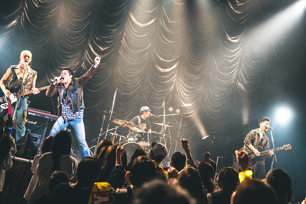 オープニングのニューカマー枠、いきなり熱風を巻き起こしたのは大阪からやってきたTHE BAMBOO SPIRITS CLUBだ。丸刈り革ジャンで常に笑顔のボーカル・ゆうしゅんを中心に、THE BLUE HEARTS直系のカラッと激しいパンクロックをぶっ放すストロングスタイル。初めて見る人にも遠慮なく手拍子とコーラスを呼びかけ、度胸と愛嬌でぐいぐい押す。曲は「We got you」「どろくさいミュージックをくれ」「人間ロック」「この世の全ては感謝しかない」の4曲で、どの曲も愛と感謝と元気をまっすぐに伝えてケレン味なし。低音の豊かな響きに特徴を持つ、ゆうしゅんの歌声もとても魅力的。2024年結成、あっぱれ若武者のういういしいパフォーマンスだ。