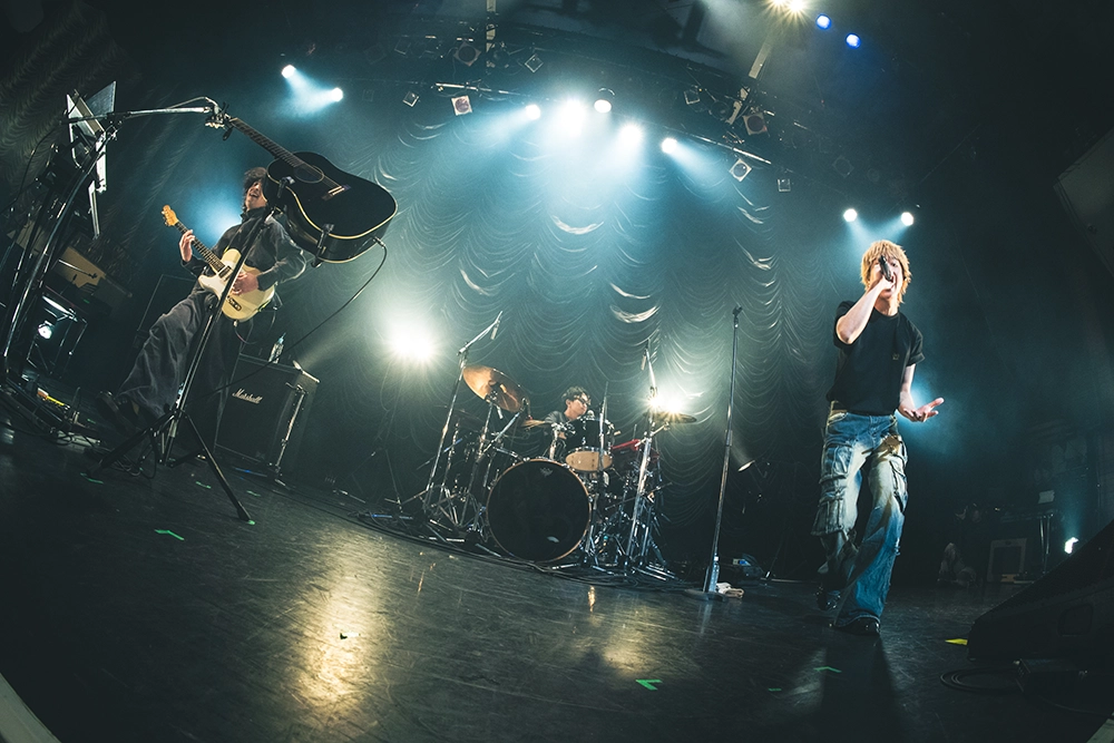 勢いよくステージに飛び込み、そのまま全力で突っ走るTHE AGULは3月20日で結成7年、ボーカル・ケンとギター・祐亮+サポートドラムの形で出演。メロディアスなギターロックとダンサブルなエレクトロのミクスチャーで、アコギとエレキを併用しながらどっしり構える左利きの祐亮、金髪長身で暴れまわるケンのコンビがとにかくインパクト大。「BLUE」「Five Ball」「I Don't Care」と、3曲歌ったところでケンの姿が見えない?と思ったら、「Y.A.T.O」を歌いながら2階フロアに現れて「みんな立って!」と煽りまくる、体を張ったパフォーマンスに情熱がみなぎる。表舞台に出る前のケンが「一番大好きな曲」だったというベリーグッドマン「花束」のカバーに万感の思いがこもる。ラストチューン「Your Dream」まで全身全霊で歌いきって「最後まで楽しんで!」と呼びかける、心の熱さが音楽にもにじみ出てすがすがしい。