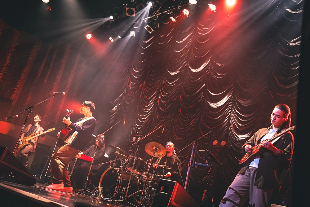 熱いバンドサウンドが二組続いたあと、アコースティックギター弾き語りで一陣の涼風を吹かせたのは、鹿児島からやってきたシンガーソングライター・わかまつごう。ベリーグッドマン「コンパス」を口ずさむ粋なオープニングから、サポートキーボード・仙田葉子と共に奏でるアコースティックな音世界は、フォークソングというより静かなオルタナロックを感じる底深いものだ。田舎から都会を見つめる視線が鋭く突き刺さる「ことはちゃん」「How about seeking Another one」、日々の心に映るよしなしごとを丁寧に綴る「すきにくるいすきにまようまた」「日々の詩」など、言葉と歌の力が痛いほどに迫り来るが、不思議と心地よさを感じる独特の世界観。眼鏡に坊ちゃん刈り、歌は格調高くシリアスだがしゃべりだすとニコニコのギャップも楽しい。こういうアーティストが所属しているからARIGATO MUSICは面白い。