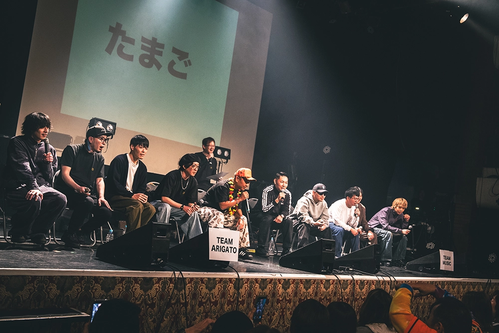 ここで一息、フェス10年にして初の試みとなるゲームコーナーは、出演アーティストが5人ずつ、ARIGATOチームとMUSICチームに分かれて「事務所社長による素敵なプレゼント」を競う対抗戦スタイル。ベリーグッドマンも参加して、ここぞとばかりに張り切るMOCAを中心に、一種目目「言いまちがい人狼」から珍プレー好プレー連発で盛り上がる。二種目目「ジェスチャーゲーム」はファンが主役、観客だけに見えるキーワードをジェスチャーで出演者に教えるスタイルで、「うさぎ」はわかるが「ベリーグッドマン」はなぜか伝わらないなど、予想外の展開に場内爆笑。30分に及ぶ熱闘の果て、勝利はRover率いるMUSICチームで、MOCA率いるARIGATOチームは「ものすごく苦いお茶」を飲み干す罰ゲームでジ・エンド。みなさまお疲れさまでした。しかし結局、勝者に贈られる「素敵なプレゼント」が最後まで何だかわからなかったような…。