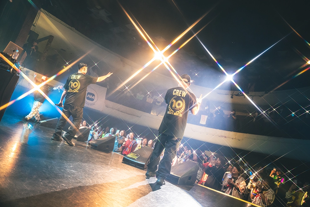 フェスのトリを飾るのはもちろんベリーグッドマンだ。1曲目「ライトスタンド」で観客全員のハートをぎゅっとつかんで一体感を作ると、「オドリバ★ジャポニカ」でダンスの波に乗せて一気に飛ばす。いつものようにMOCAがフロアに下りて観客をステージに引っ張り上げ、「チョベリグ」から「Vibes UP!!」と強力ダンスチューン三連発で大騒ぎ。MOCAがターゲットの女性と謎のダンスを繰り広げるのをHiDEXがスマホで撮っている。ステージの上も下も分け隔てなく距離が近いのがベリグの、ARIGATO MUSICの特徴だ。