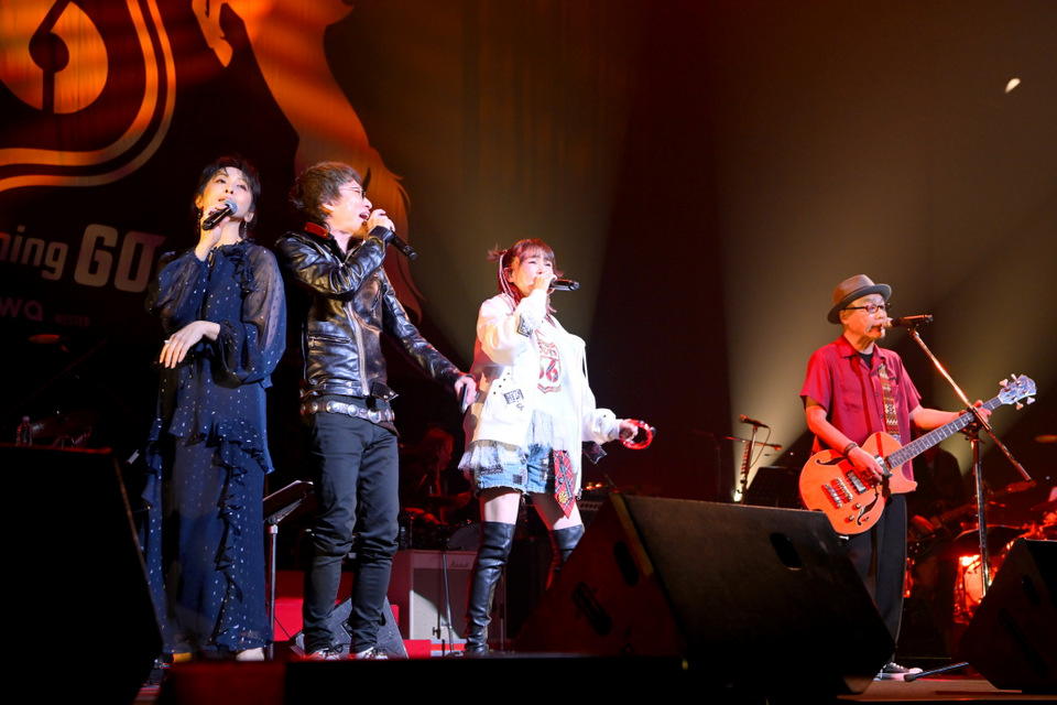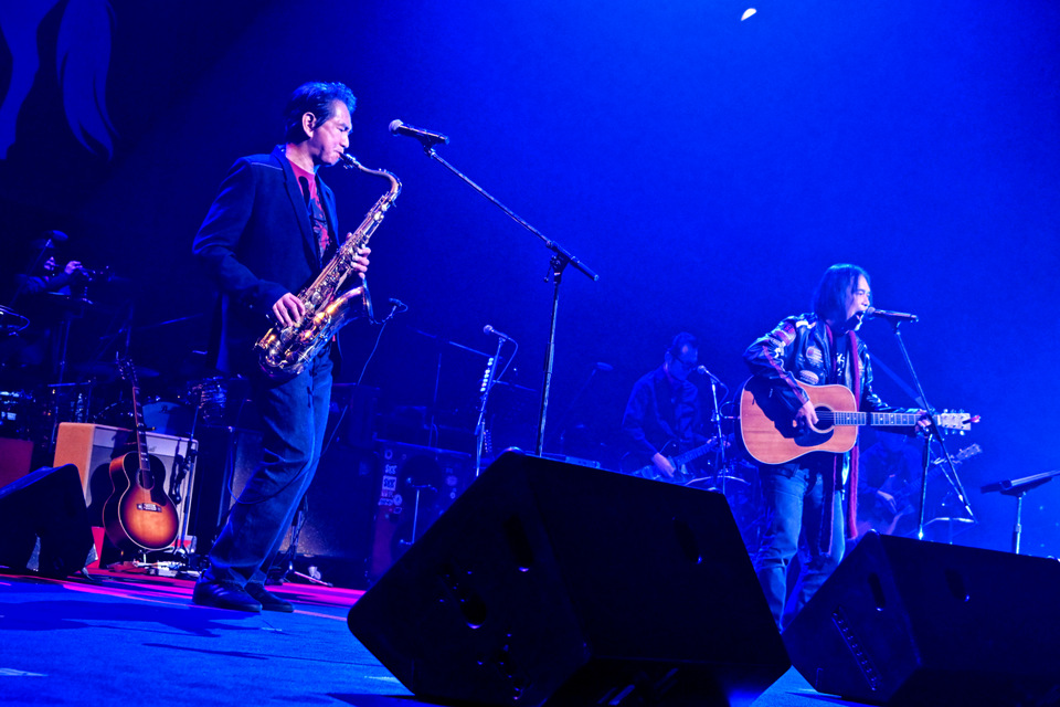 まずオープニングはROOTS66 ULTRA BANDによる、往年のドラマ『太陽にほえろ!』『傷だらけの天使』のテーマ曲の演奏。続いては、ROOTS66 GREAT SINGERSが歌を1コーラスずつ歌ってリレーしていくメドレーのコーナーだ。そのトップは宮田和弥(JUN SKY WALKER(S))による「START」で、以後は生年月日の順。なおこれは2016年に引き続いての企画だが、前回は次の人の曲を歌いながら紹介していく『夜のヒットスタジオ』形式だったのが、今回は自分の歌を披露するスタイルになっていた。そんな中でも無数のハンドウェーブが客席に生まれた田島貴男(Original Love)の「接吻」、そしてトータス松本(ウルフルズ)が熱く歌い上げる「バンザイ~好きでよかった~」と、いきなり見せ場だらけ!開演直後から熱い。