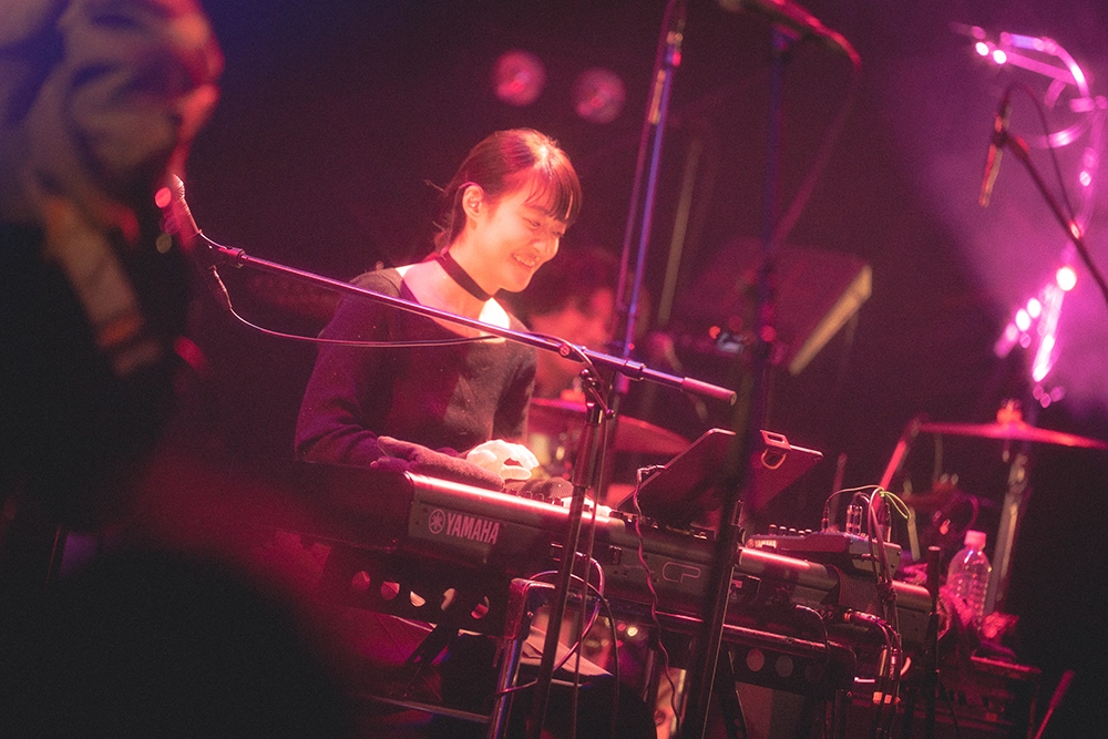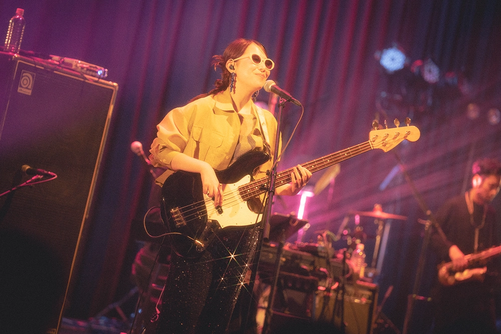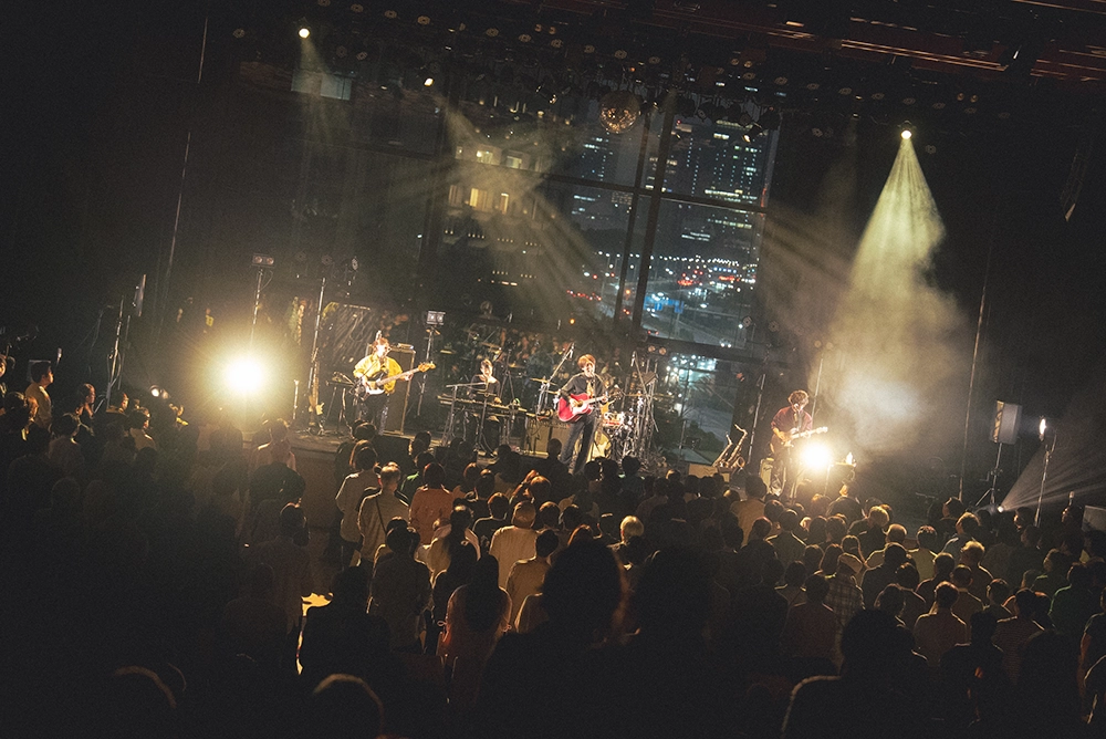フィナーレが近づく最終セクションは、ブレッド&バターのカバーソング「ピンク・シャドウ」のしなやかなグルーヴから。間奏にメンバー紹介を兼ねたソロパートをはさみ、キーボード・はらかなこ、サックス・藤田淳之介(TRI4TH)にもしっかりスポットを当てて結束をアピール。間髪入れずに「missing summer」で夏を先取り、心地よく弾むリズムとファルセットを交えた色気あるボーカルでフロアを揺らすと、残すは1曲。