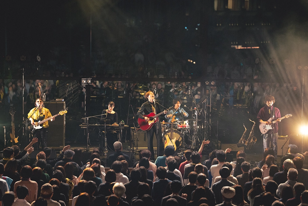 メランコリックなピアノのイントロを添えた「ハーフムーンが見えたらさよならを」は、常田真太郎(スキマスイッチ)プロデュースによる素晴らしいバラード。繊細なボーカルの表現力とあいまって、ライブで聴くとメロディの美しさと歌詞の切なさが倍増する。しっとりバラードとロック的な高揚感を併せ持つ「夜明けの列車に飛び乗って」と2曲合わせて、ネオニューミュージックを掲げるバンドの真骨頂を聴かせる楽曲が続く。もう一つの声のように吹きまくるサックスの存在感も抜群だ。