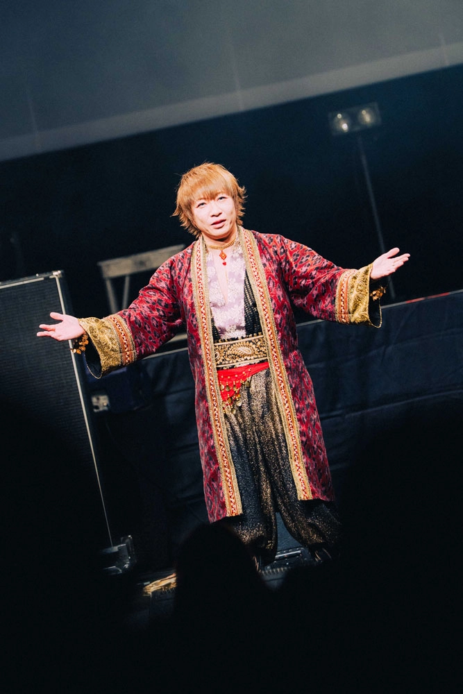 一日目のトリを飾るのは、もちろんPsycho le Cému。最高指揮官YURAサマがナーガ(蛇神)の毒におかされ、神々の世界が危機に瀕しているシーンのお芝居から「BLADE DANCE」でライヴがスタート。5人のダンスにDAISHIのラップと、Psycho le Cémuらしい幅の広さは、次の「シャクティシャクティアスティ」でさらに広がる。エキゾチックなサウンドですっかり異国ムードになったところで一転、「お前たちに贈ります」と、デビュー曲「愛の唄」から、彼らの魅力のひとつである歌を真っ直ぐに聴かせる曲を続けていく。なかでも「FANTASIA〜恋の幻想曲〜」は、ここ数年のライヴで耳にしたなかでもピカ一の出来栄えと言ってもいいほどで、ぐっと心を打った実感があった。