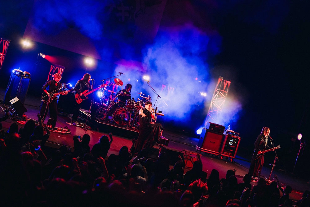 単純にふたつに分けることが許されるなら、氣志團が陽キャであるのに対し、こちらは陰キャと言ってもいいかもしれない。続くは、キズの登場。ステージに現れるメンバーを観客が拍手で迎え入れたが、張り詰めるような緊張感が会場全体を支配していく。ピアノの調べから、来夢の歌声が重なって始まった「鬼」。自在に強弱をつけた歌声は、会場を圧倒するように響き渡る。物理的にも印象的にも仄暗く、重苦しい空気が漂っていた。そんな閉塞感さえ漂っていた空間に、変化を生じさせたのは「黒い雨」。曲の展開に連れてステージに光が差すと、まるで救いがもたらされたかのように感じられた。
